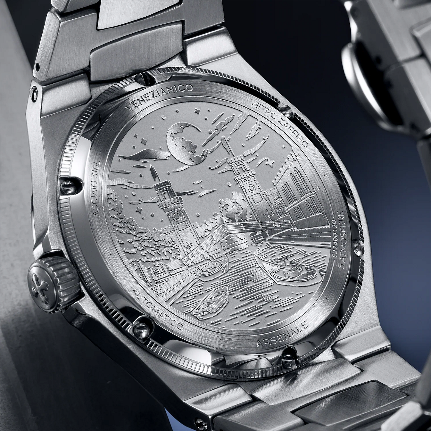 Este complexo monumental tornou-se o centro do poder marítimo de Veneza, provando que mesmo uma construção antiga poderia estar na vanguarda da tecnologia e moldar o futuro da indústria. Assim como o Arsenale histórico, este relógio representa a fusão perfeita entre tradição secular e inovação contemporânea, carregando no pulso a herança de quem sempre esteve à frente do seu tempo.