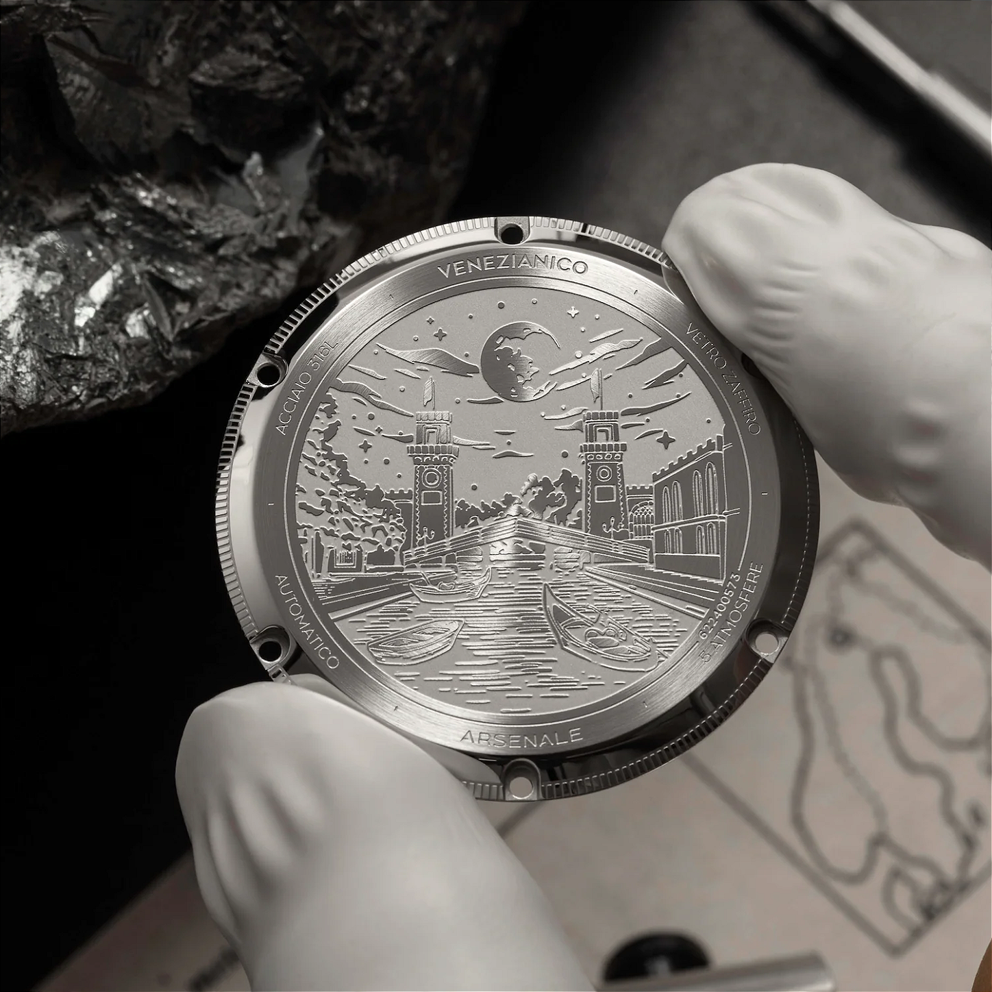 A gravação cuidadosa das torres representa mais que um tributo visual - simboliza a conexão profunda entre tradição e inovação que define nosso ofício. Assim como o Arsenale Veneziano fundiu avanços tecnológicos com artesanato sólido, este timepiece combina elementos clássicos da relojoaria com design moderno.