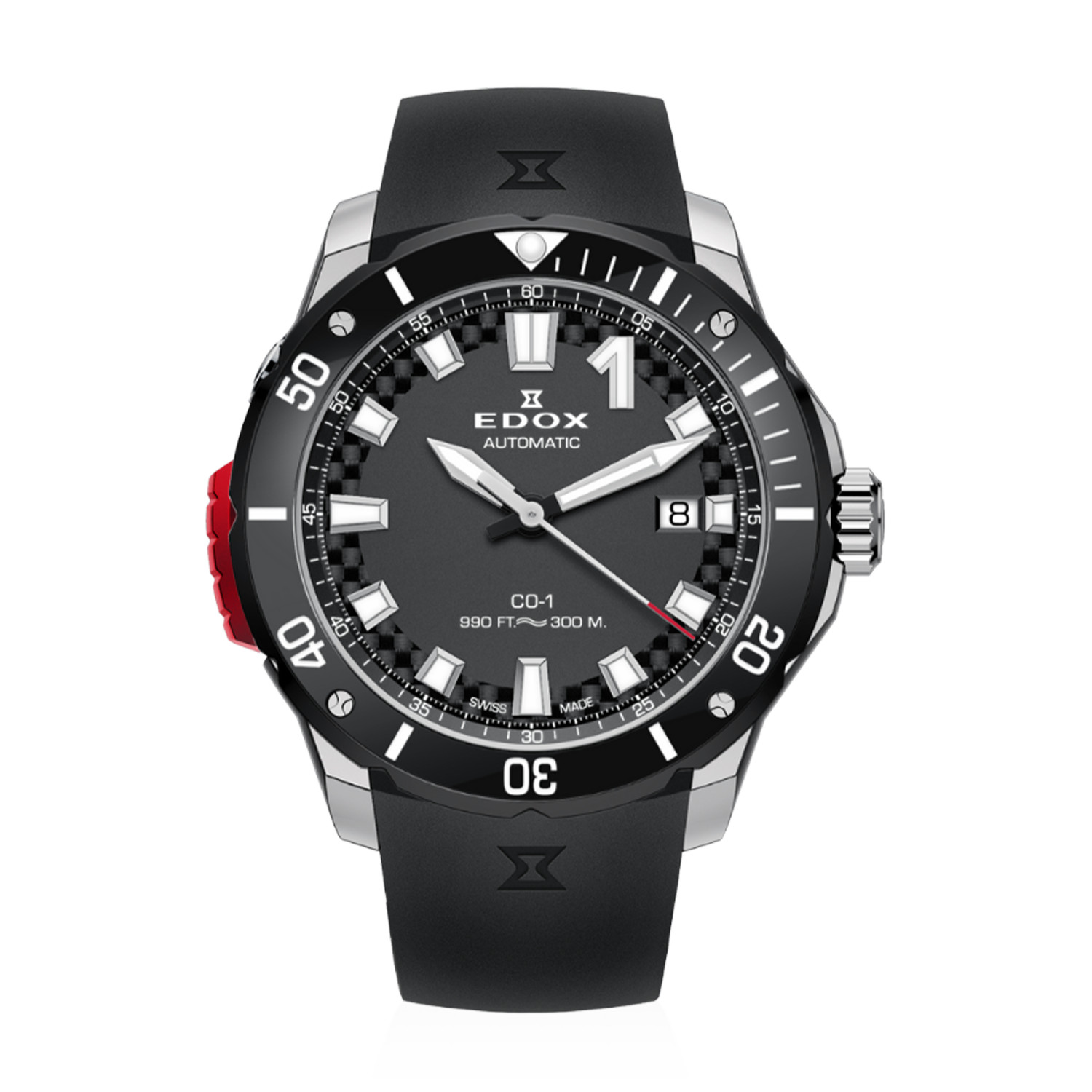 O mostrador preto com padrão de carbono, ponteiros e índices com Super-Luminova X1 e cristal de safira antirreflexo garantem leitura perfeita em qualquer condição. Resistente à água até 300 m e equipado com válvula automática de hélio, é ideal para esportes aquáticos e mergulho profissional, com design moderno e presença marcante no pulso.