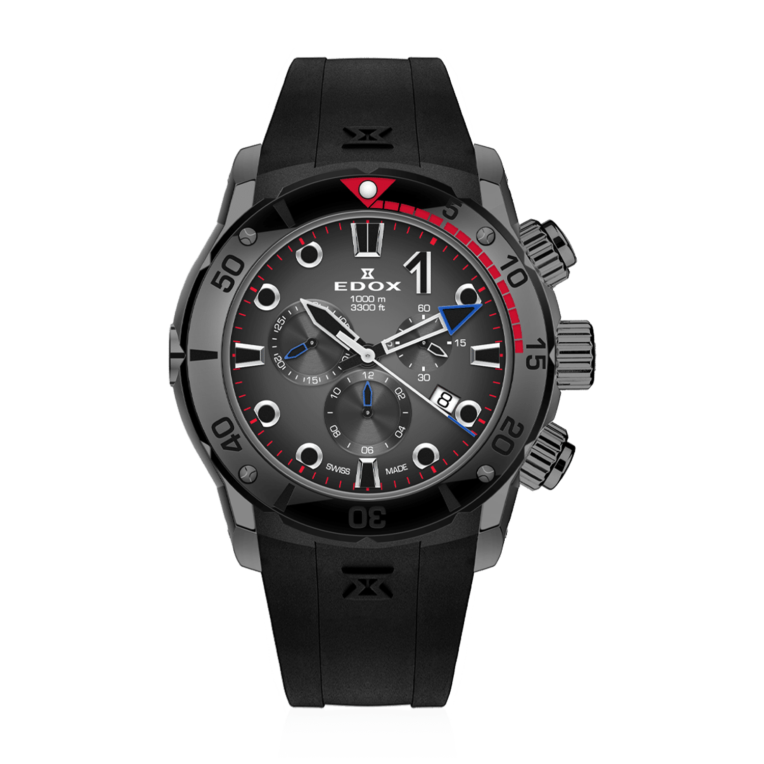 O movimento quartz Edox Caliber 102, baseado no robusto Ronda 5030 D, oferece cronometragem precisa com contadores de 30 minutos e 12 horas, enquanto o mostrador com detalhes em vermelho e azul garantem legibilidade máxima mesmo nas condições mais adversas. A caixa de 45mm em aço inoxidável mantém perfil surpreendentemente confortável, provando que performance extrema e elegância urbana podem coexistir perfeitamente.