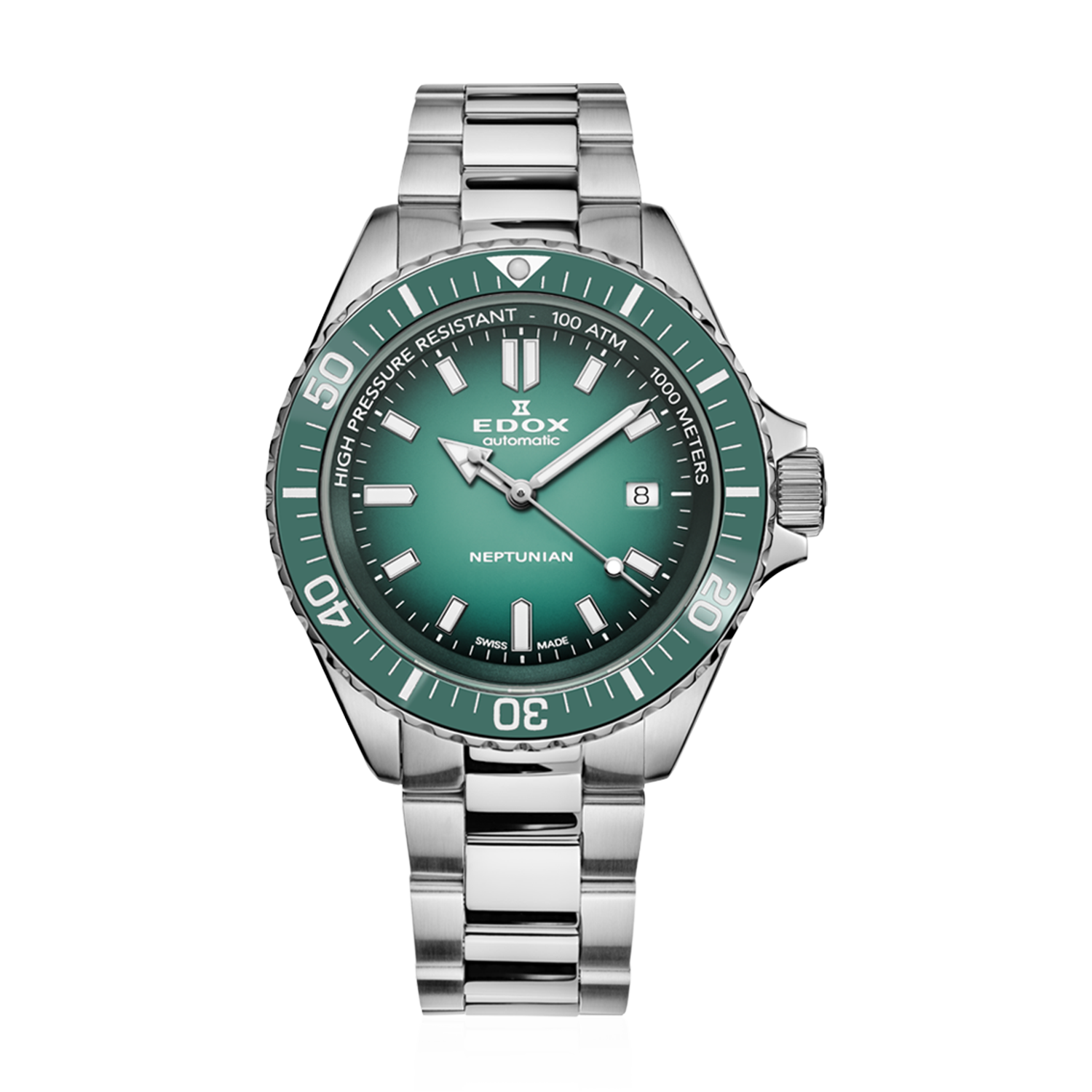 Com caixa de 44mm em aço inoxidável 316L, cristal de safira com revestimento antirreflexo e pulseira de aço que afina de 22mm para 18mm, o Neptunian oferece presença no pulso sem comprometer o conforto. O sistema duplo de O-rings patenteado pela Edox e a espessura de apenas 15,6mm demonstram a engenharia suíça em sua forma mais refinada para exploradores dos oceanos.