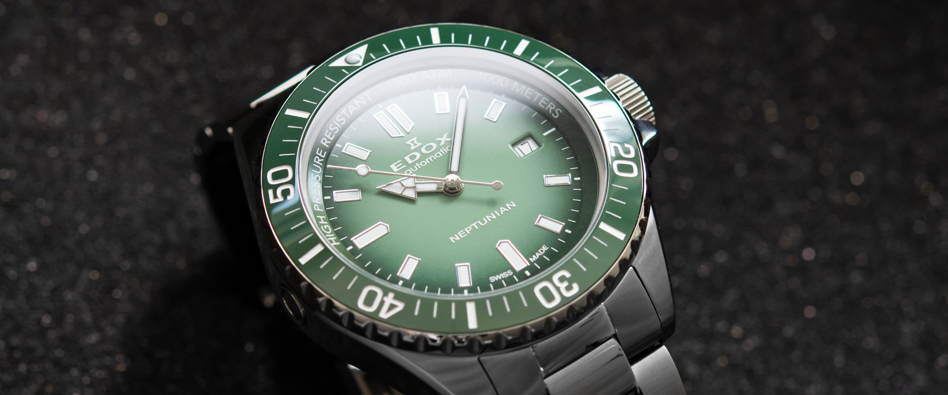O Edox Neptunian Automatic 80120-3VM-N-VDN1 redefine os limites da relojoaria submarina com impressionantes 1000 metros de resistência à água e válvula de hélio automática. Inspirado na tradição dos relógios SkyDiver dos anos 1970, este mergulhador profissional suíço combina o movimento automático Sellita SW200 com mostrador verde e bezel cerâmico unidirecional, criando uma ferramenta técnica de alta performance.