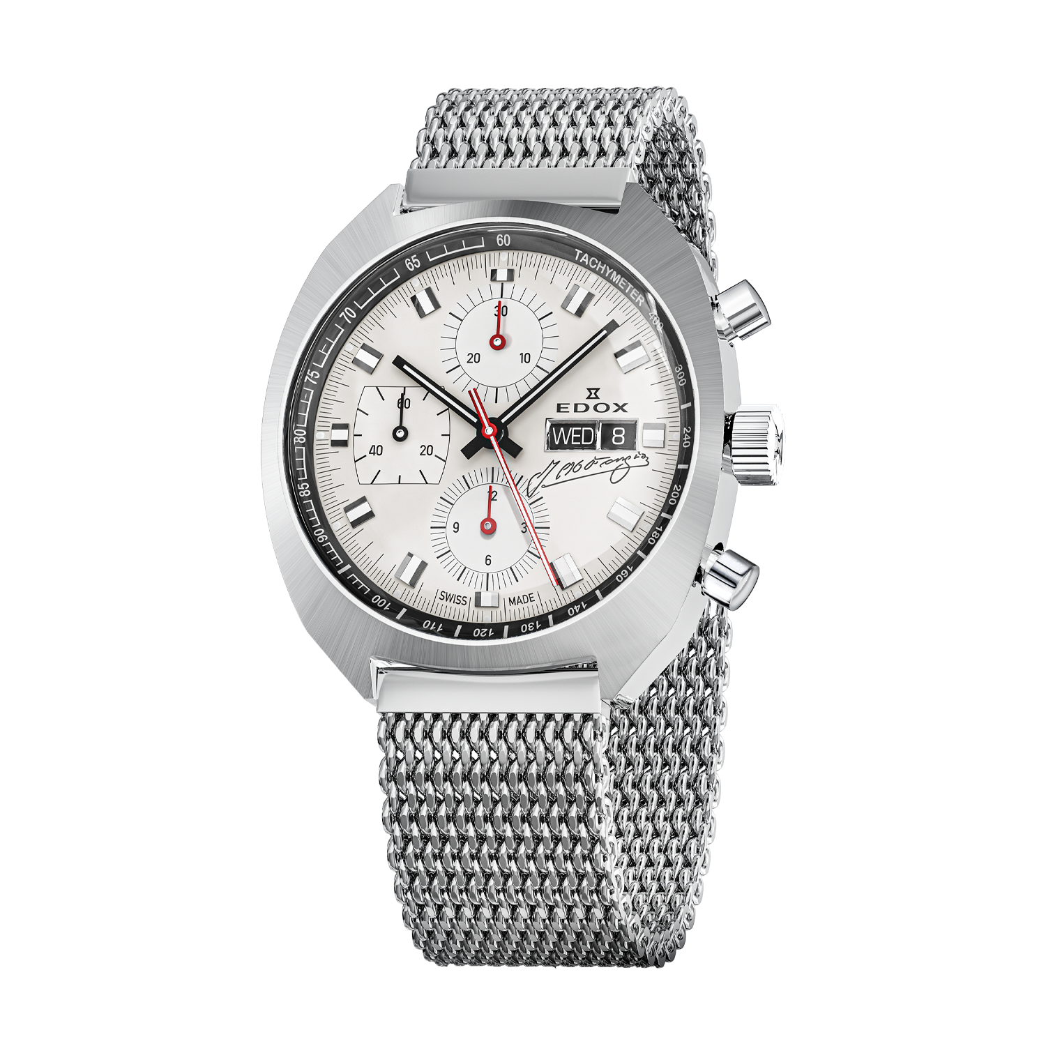 Para homenagear esse legado extraordinário, a Edox fez uma parceria com o prestigiado Museu Fangio para criar duas edições limitadas do seu Cronógrafo Sportsman, como uma homenagem aos 115 anos do legado duradouro de Fangio. Produzido em duas versões exclusivas, cada uma limitada a apenas 115 peças, este relógio presta homenagem a um homem que se tornou uma lenda — e a uma era de ouro das corridas, onde a glória era conquistada e a sobrevivência nunca garantida.