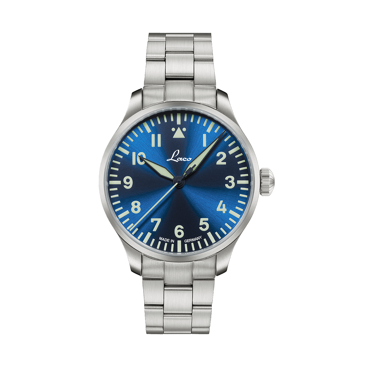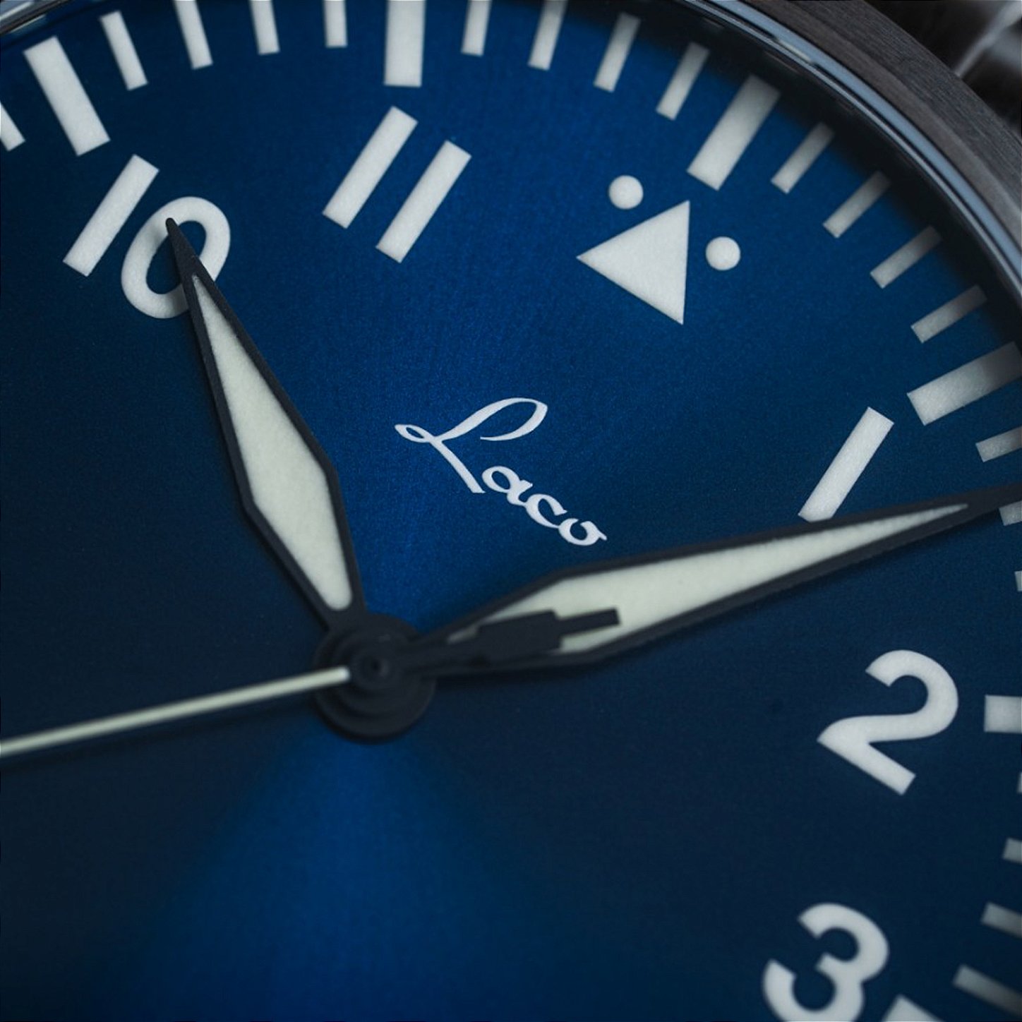 Os relógios Laco Type A foram instrumentos essenciais para pilotos alemães durante a Segunda Guerra Mundial, desenvolvidos com especificações rígidas para navegação aérea de precisão. O Augsburg Blaue Stunde honra essa herança histórica, mantendo as proporções, legibilidade e robustez dos originais.