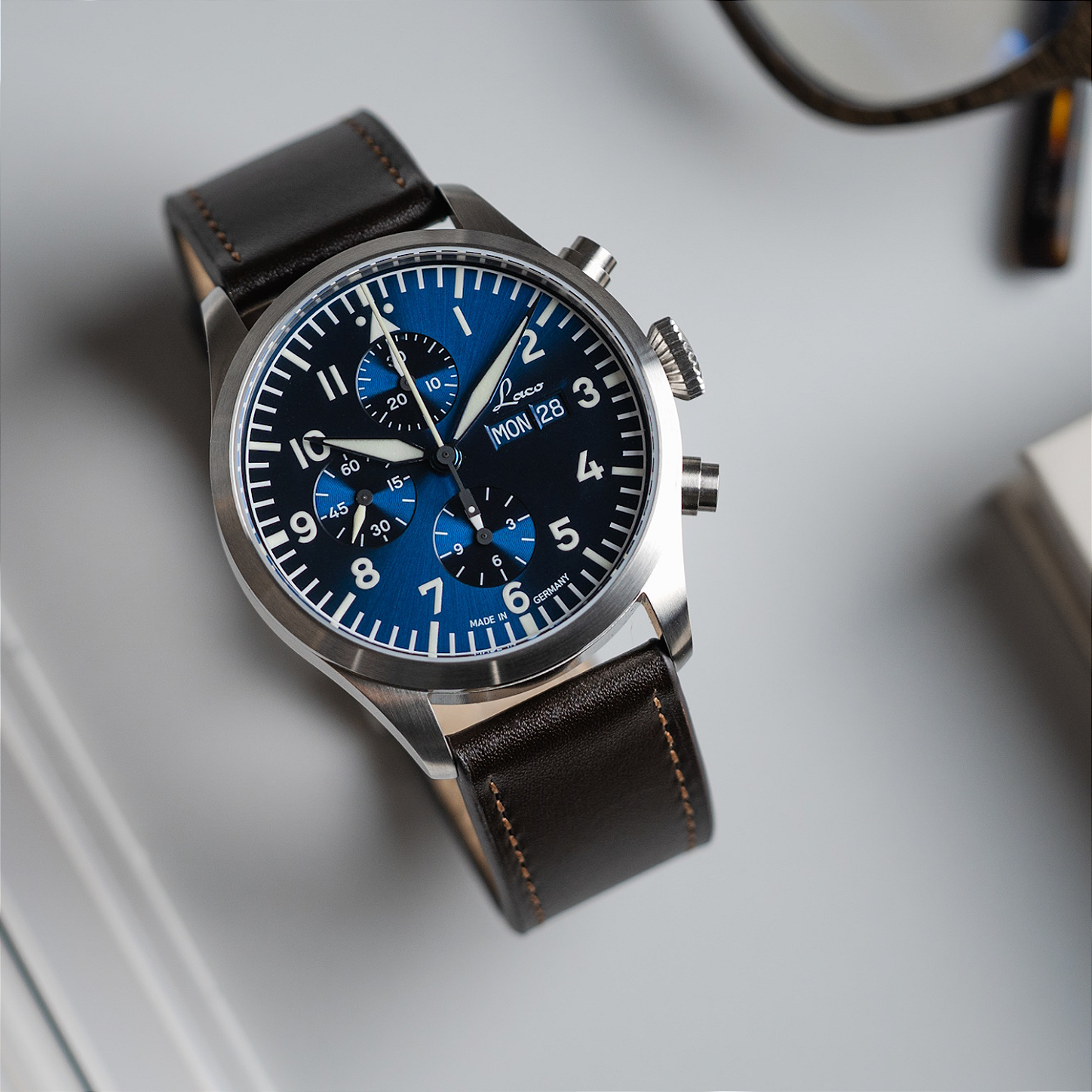 Sua caixa de 43 mm em aço inoxidável com superfícies polidas e escovadas abriga um mostrador azul com acabamento sunray de grande profundidade, numerais arábicos e índices preenchidos com Super-LumiNova C3 para leitura imediata em qualquer condição de luz. No coração, bate o movimento automático Laco 500, baseado no Sellita SW 500, com função de cronógrafo, indicação de dia e data, e reserva de marcha estendida, oferecendo precisão e robustez. O conjunto é completado por uma pulseira de couro marrom de alta qualidade que desenvolve pátina com o tempo, reforçando o caráter autêntico de ferramenta de tempo para uso diário ou em aventuras.