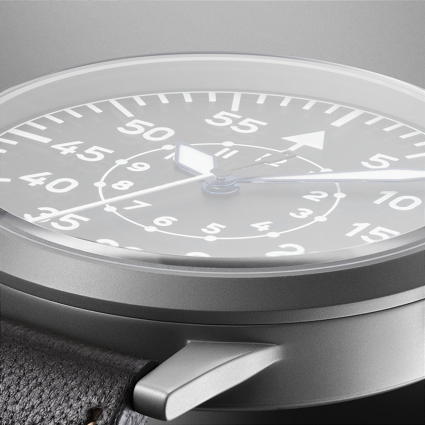 Ponteiro das horas, ponteiro dos minutos e ponteiro dos segundos. O essencial da relojoaria de aviação alemã em sua forma mais pura, com a funcionalidade adicional de parada do ponteiro dos segundos para sincronização precisa - característica fundamental dos relógios de navegação aérea profissionais.