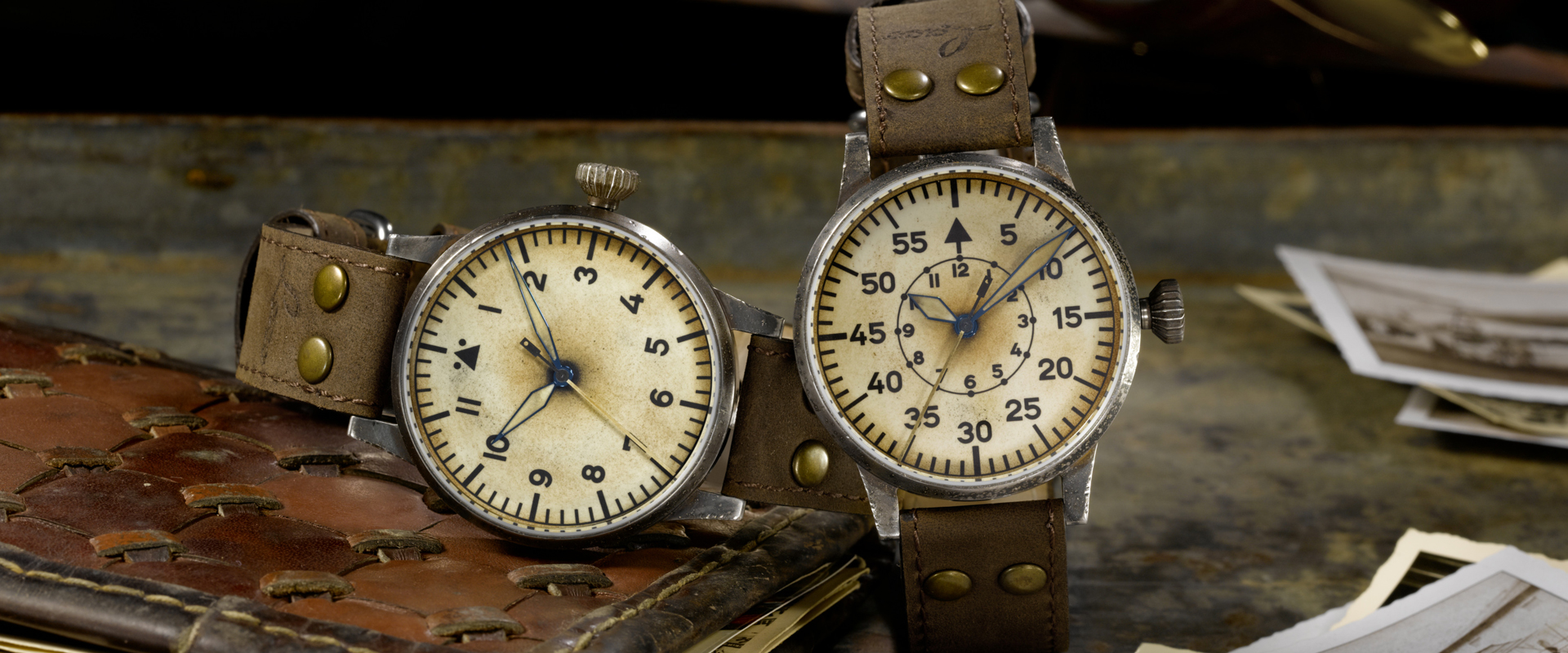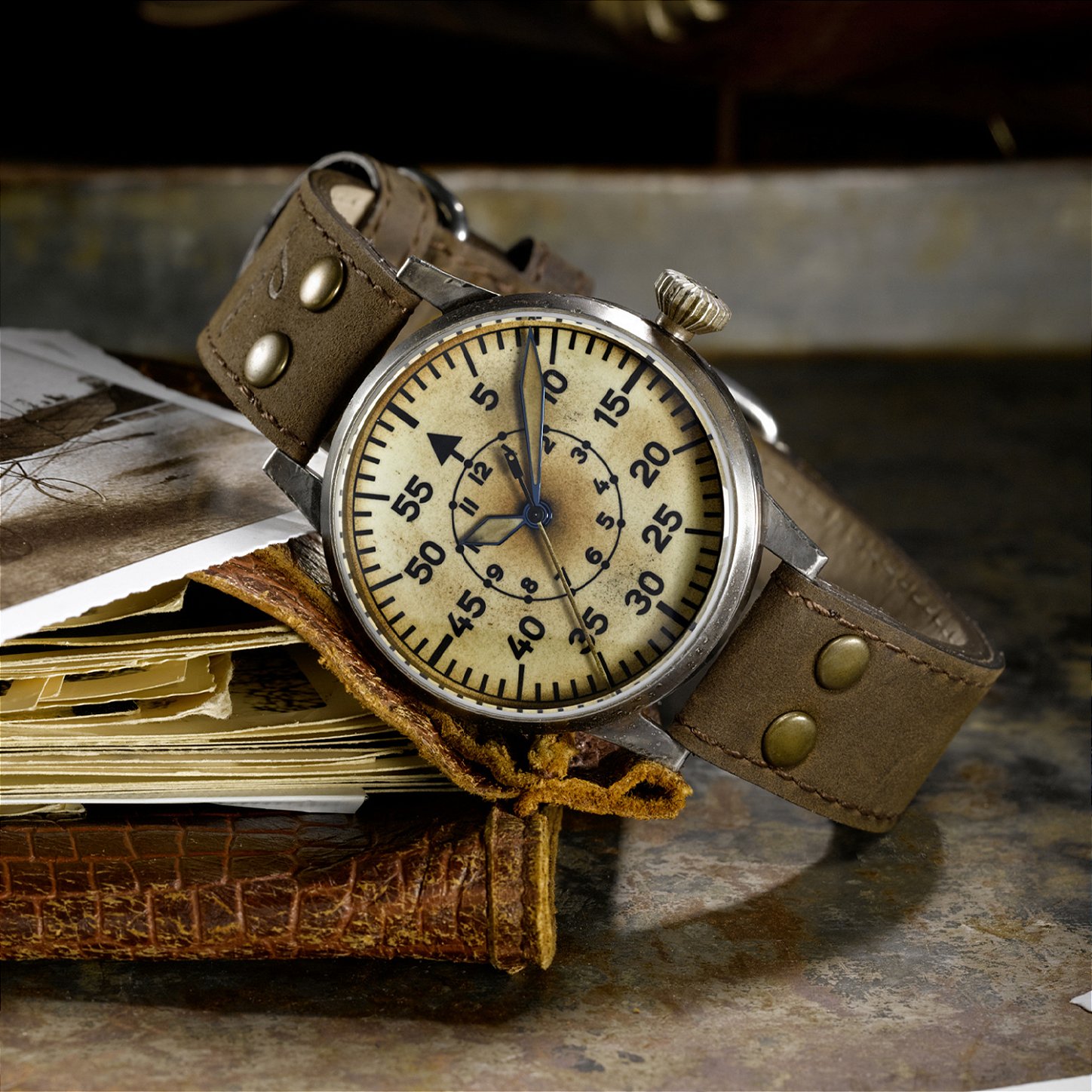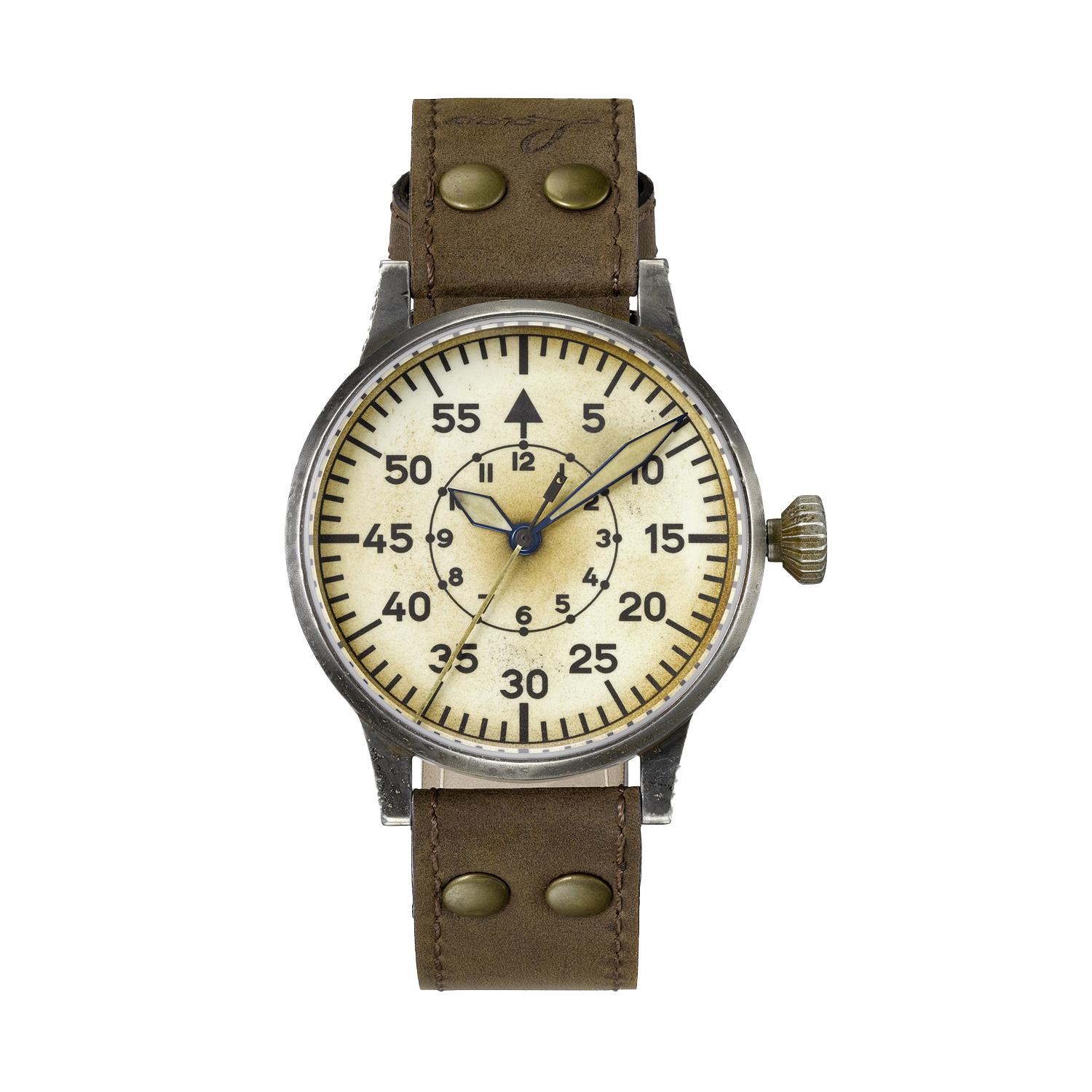 A Laco, uma das cinco manufaturas originais que produziam para a Luftwaffe, resgata essa herança técnica no Erbstück. Cada peça envelhecida artesanalmente não apenas imita a aparência vintage, mas carrega o espírito de funcionalidade absoluta que caracterizava os fliegers originais - onde cada segundo contava e a legibilidade podia salvar vidas.