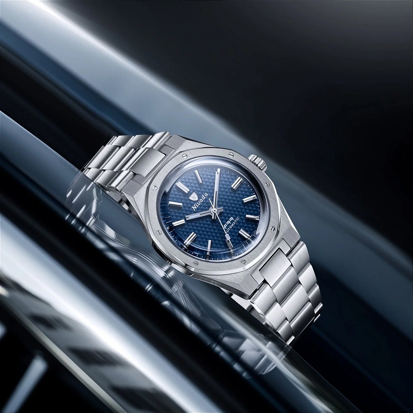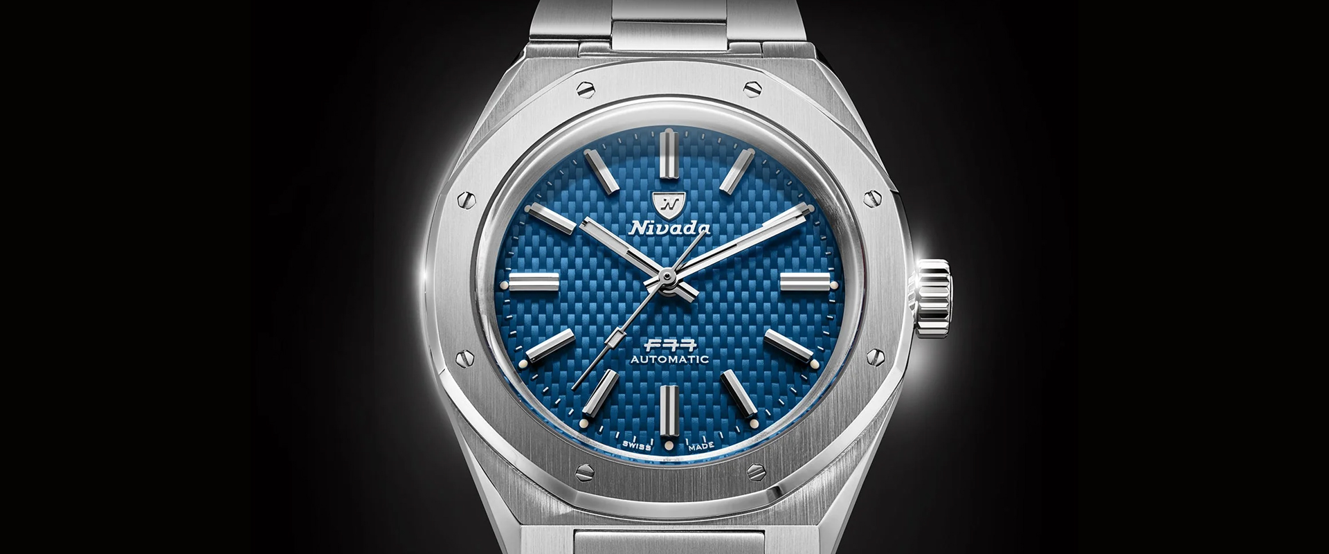 O F77 41mm Black marca um novo marco para um dos designs mais celebrados da Nivada Grenchen. Mantendo a elegância e a geometria nítida do original de 1977, esta última evolução amplifica tudo o que os colecionadores amam com uma caixa maior de 41 mm, ergonomia aprimorada e um mostrador de aparência de carbono tecido em azul distinto que brinca com a luz como metal tecido. Feito de aço inoxidável 316L com acabamentos escovados e polidos alternados, o F77 41mm combina charme vintage com uma presença contemporânea ousada.