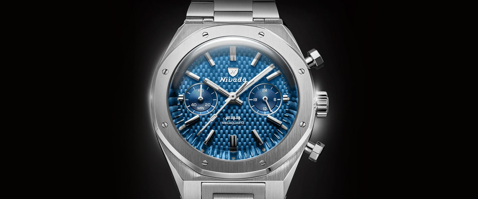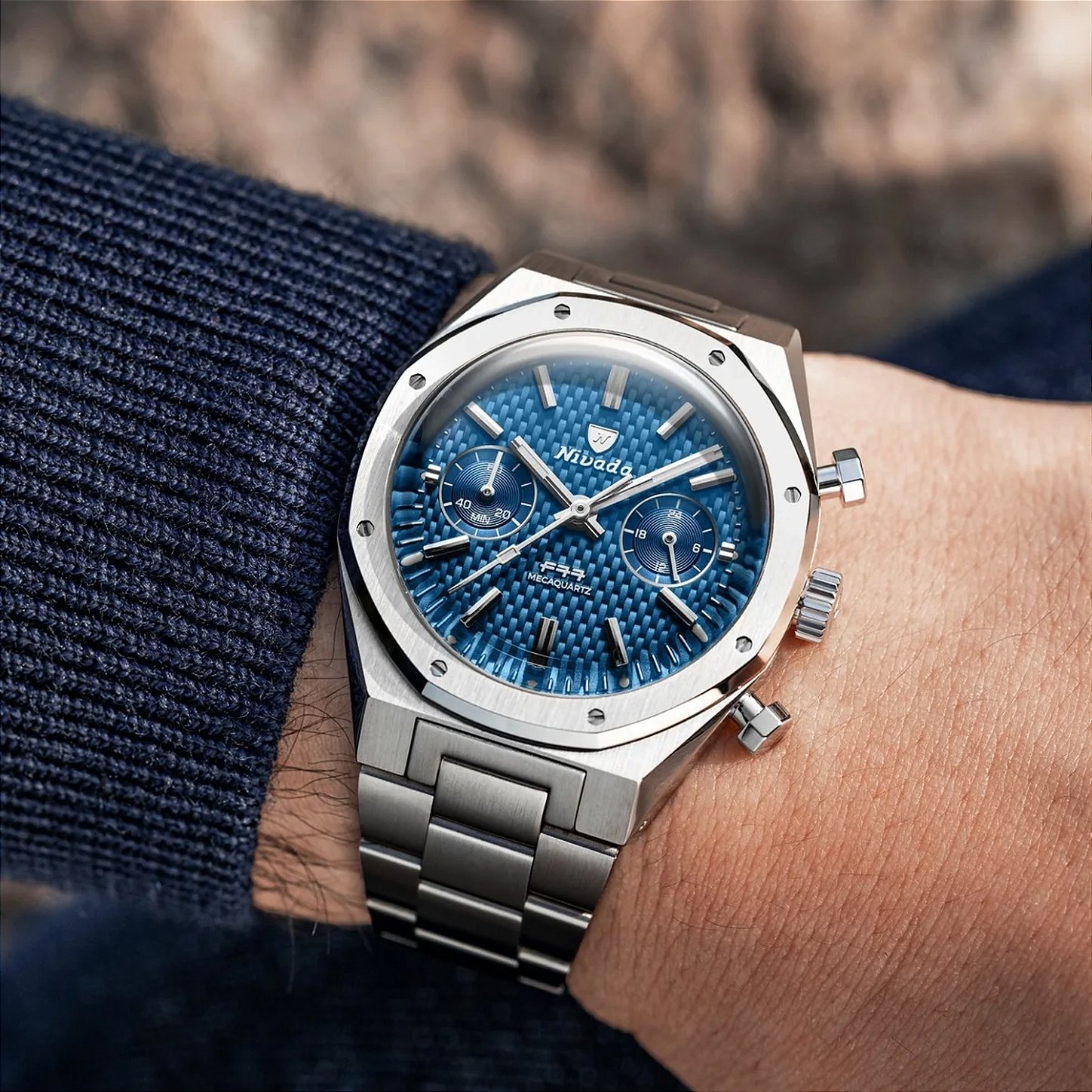 O F77 Chrono Mecaquartz Blue Woven mantém a textura que tornou o F77 original instantaneamente reconhecível. O mostrador tecido azul brinca com a luz, enquanto os dois subsales de caracol, índices aplicados e ponteiros de bastão mantêm as coisas nítidas e legíveis. A caixa de aço integrada de 38 mm, a moldura rebitada e as alças inclinas permanecem fiéis à silhueta do F77, só que agora com empurradores que sublinham sua atitude de cronógrafo esportivo.