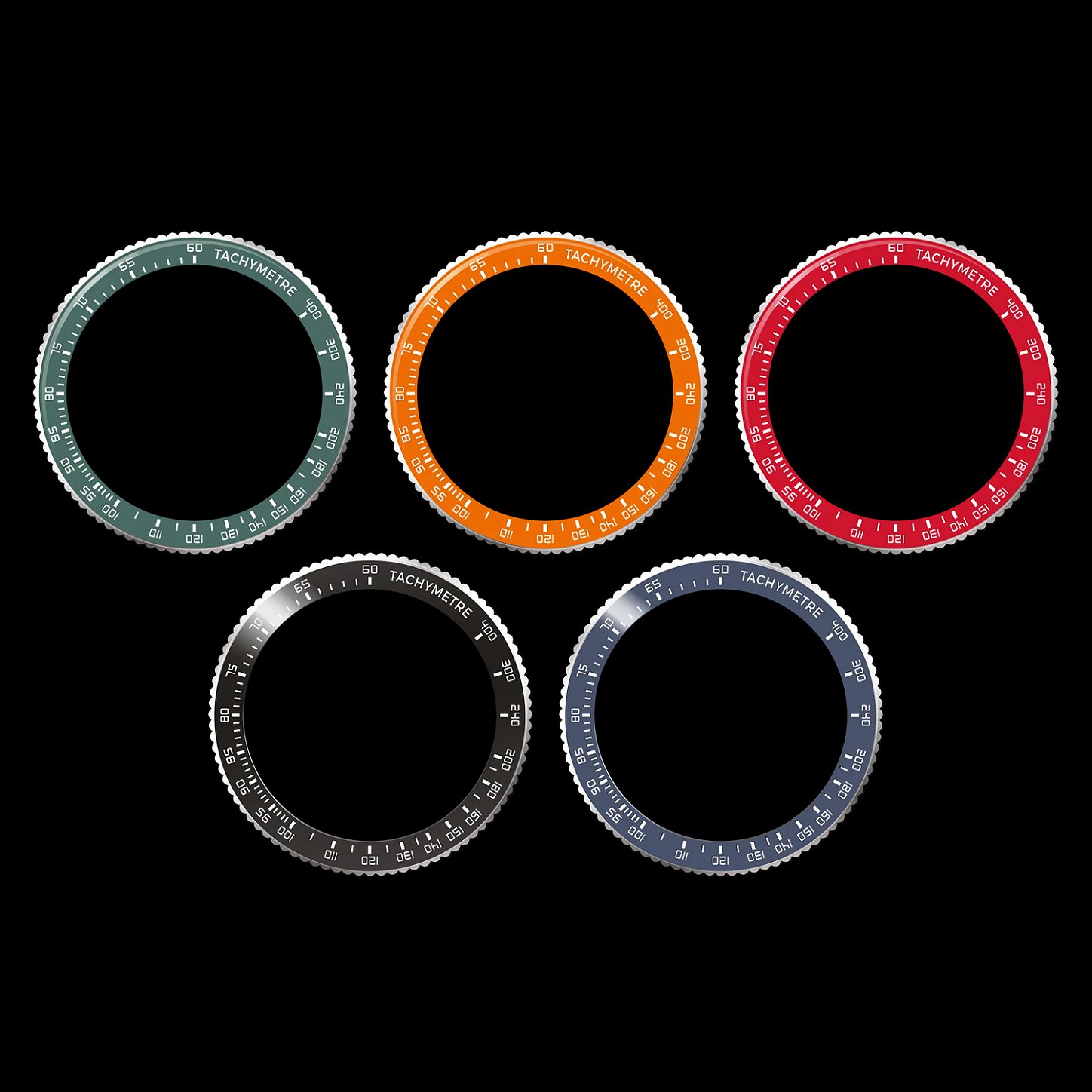 Cinco molduras de aço monocromáticas, cada uma gravada com uma escala de taquimétrica, trazem cor e contraste à coleção Chronoking.