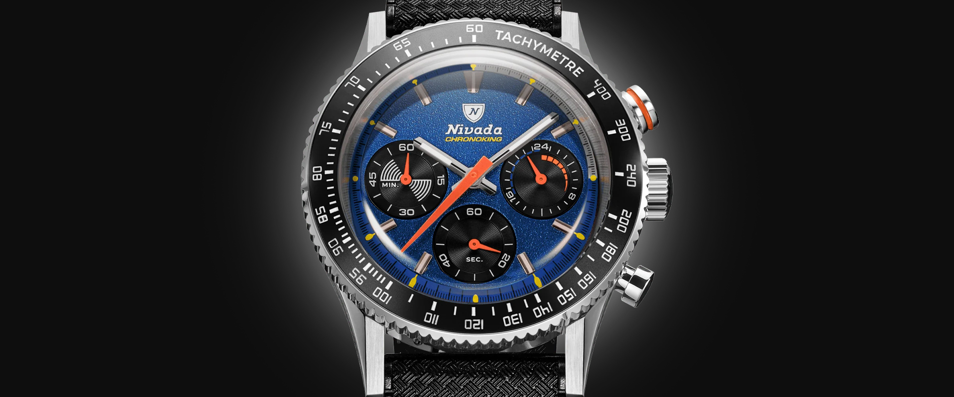 Cinco molduras de aço monocromáticas, cada uma gravada com uma escala de taquimétrica, trazem cor e contraste à coleção Chronoking.
