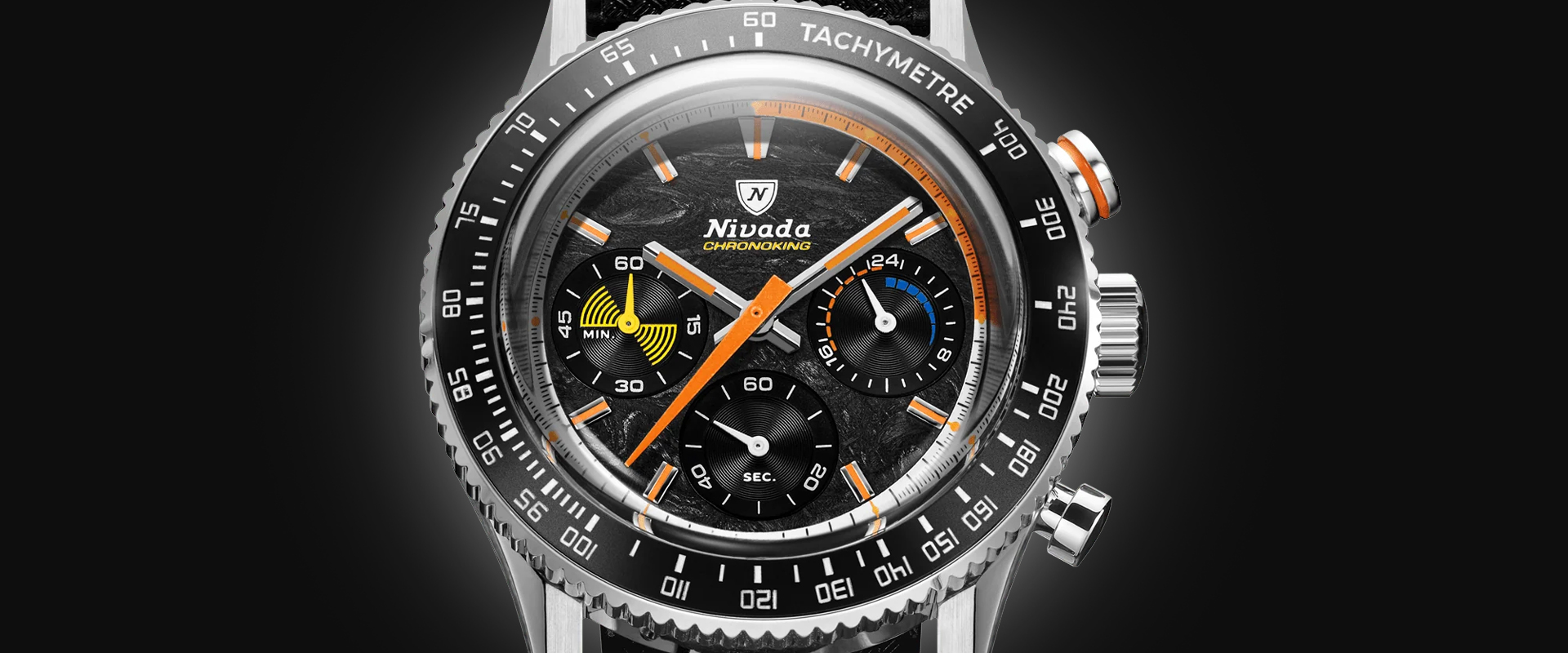 Cinco molduras de aço monocromáticas, cada uma gravada com uma escala de taquimétrica, trazem cor e contraste à coleção Chronoking.