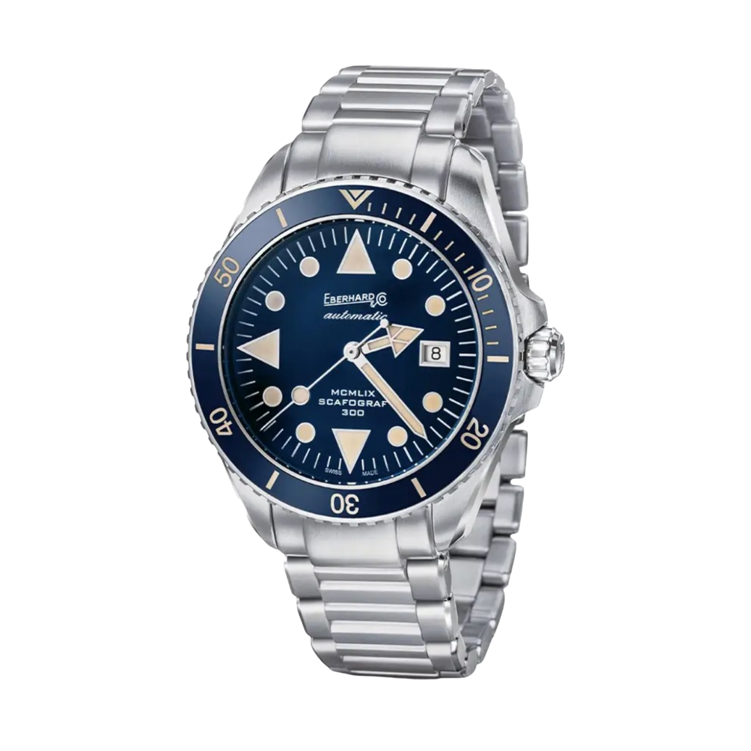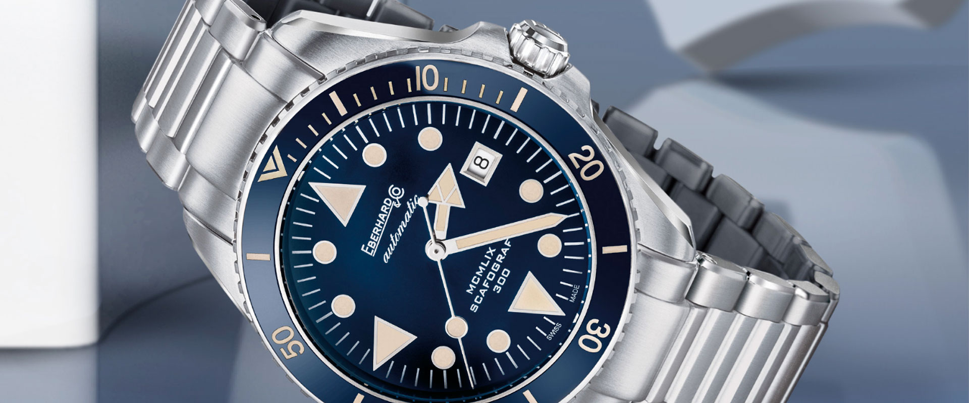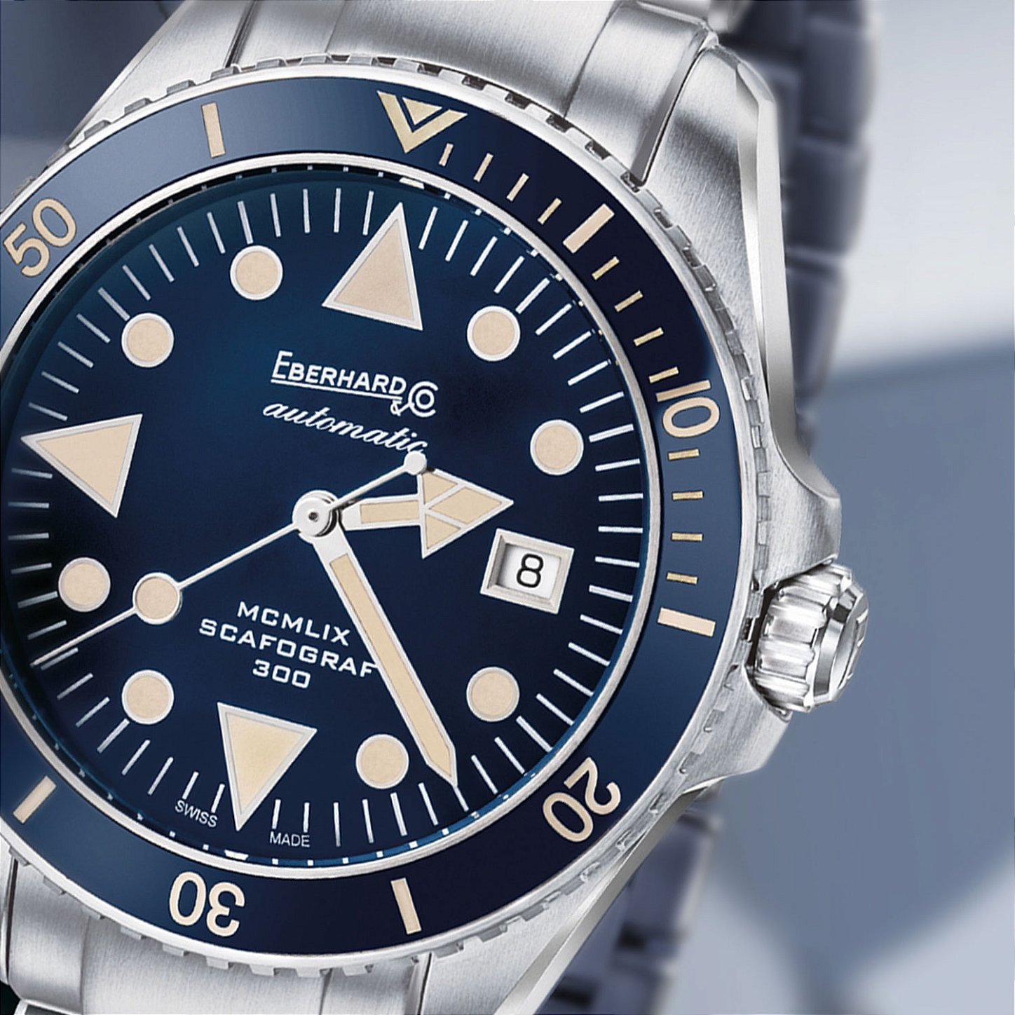 Celebrando 60 anos de herança náutica, o Scafograf 300 MCMLIX resgata o DNA original de 1959 em uma interpretação moderna para mergulhadores profissionais. Com mostrador disponível em quatro variações cromáticas e numerais romanos "MCMLIX" gravados, cada peça carrega a tradição suíça da Eberhard & Co na criação de instrumentos de precisão para exploração aquática. O design combina elementos vintage autênticos com tecnologia contemporânea, preservando a identidade visual que tornou a linha uma referência entre os divers dos anos 60.