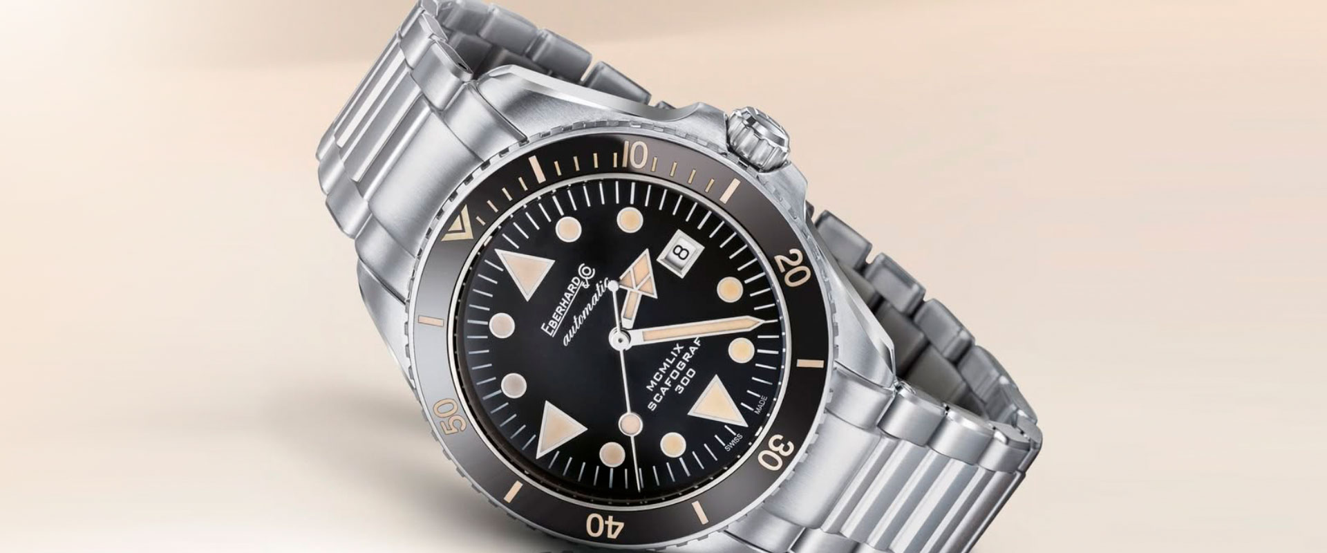 O Eberhard & Co. Scafograf 300 MCMLIX representa uma homenagem aos 60 anos de um dos mais icônicos relógios de mergulho suíços. Com mostrador "galbé" preto fosco e luneta cerâmica unidirecional, este diver de 43mm combina a estética vintage dos anos 1950 com tecnologia contemporânea, mantendo a herança de um modelo que conquistou o Grand Prix d'Horlogerie de Genève em 2016.