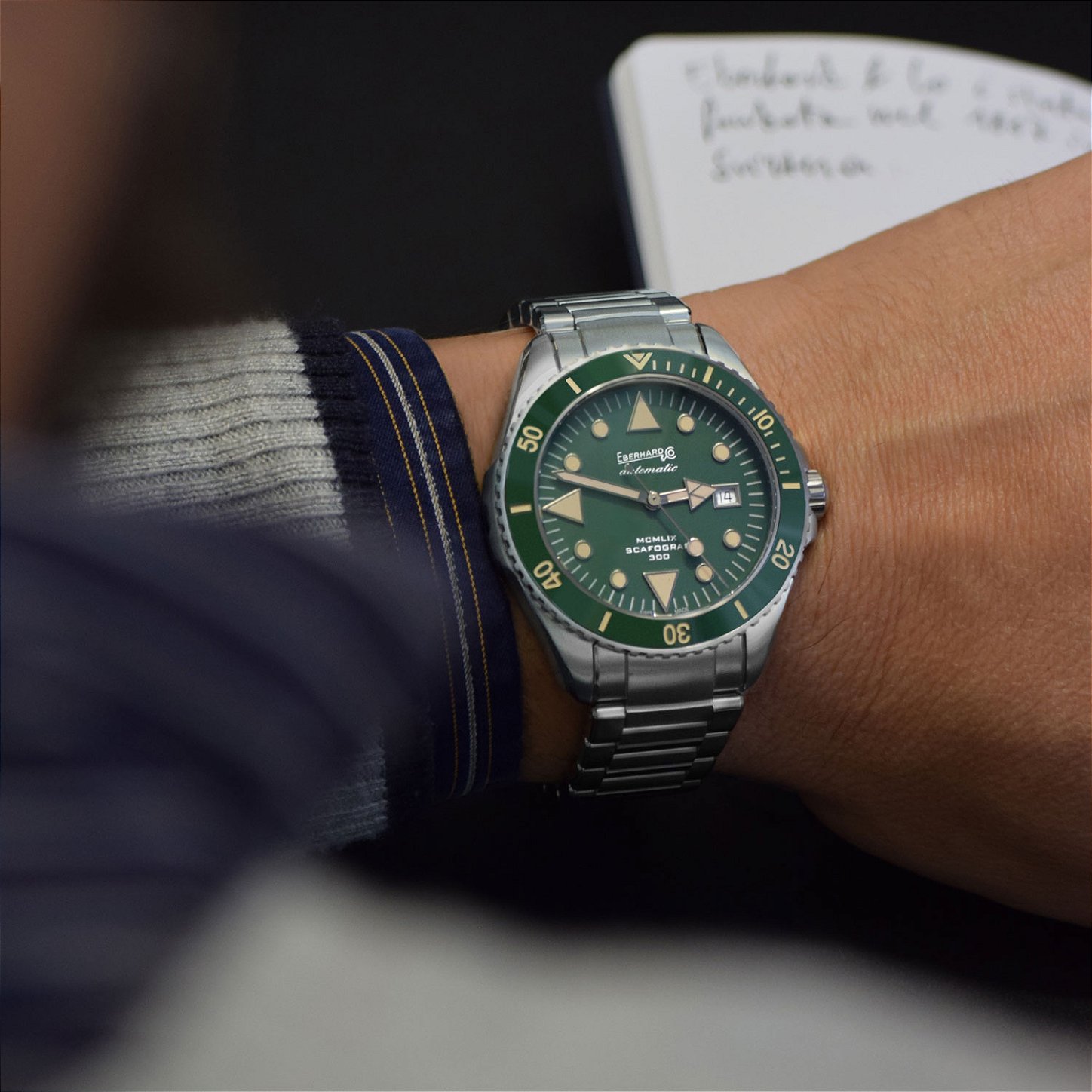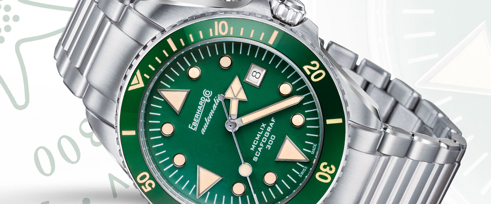 O Eberhard & Co. Scafograf 300 MCMLIX celebra 60 anos de herança subaquática com uma releitura moderna do icônico diver de 1959. O mostrador fosco disponível em múltiplas cores combina índices aplicados redondos e marcadores triangulares característicos às 6, 9 e 12 horas, enquanto a luneta unidirecional em cerâmica com marcações luminescentes vintage nos primeiros 15 minutos garante legibilidade mesmo nas profundidades. O numerário romano MCMLIX gravado no mostrador homenageia o ano de nascimento da coleção, transformando cada peça em um tributo tangível à história da relojoaria suíça de mergulho.