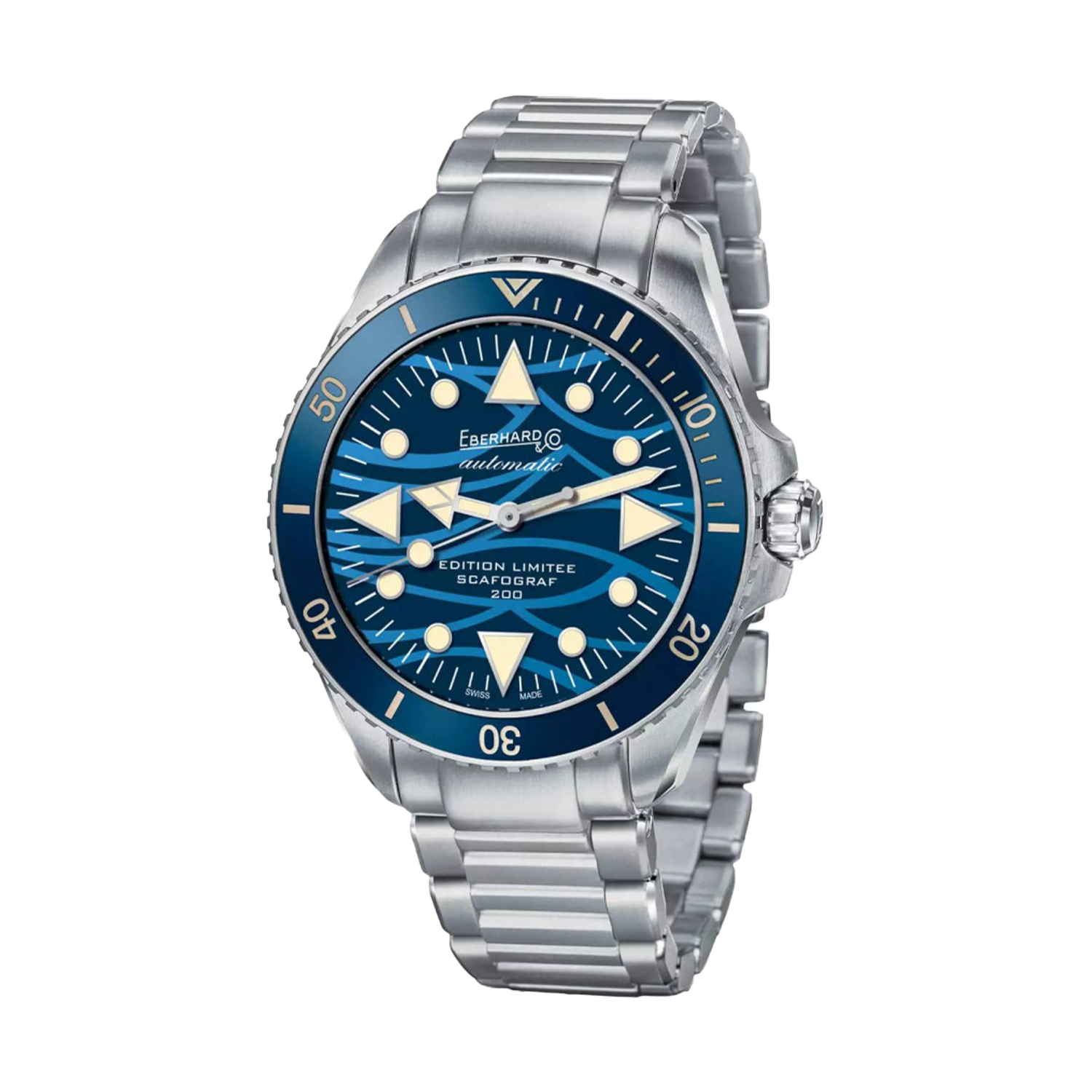 Edição limitada em apenas 137 peças, o Scafograf 200 "Onde Bleue" reinterpreta o lendário mergulhador suíço com um mostrador azul profundo estampado com ondas que evocam o fluir do tempo marinho. Inspirado no modelo original de 1959 que marcou o início da aventura náutica da Eberhard & Co., este relógio preserva os marcadores triangulares icônicos e as proporções clássicas que definiram uma era da relojoaria esportiva italiana.