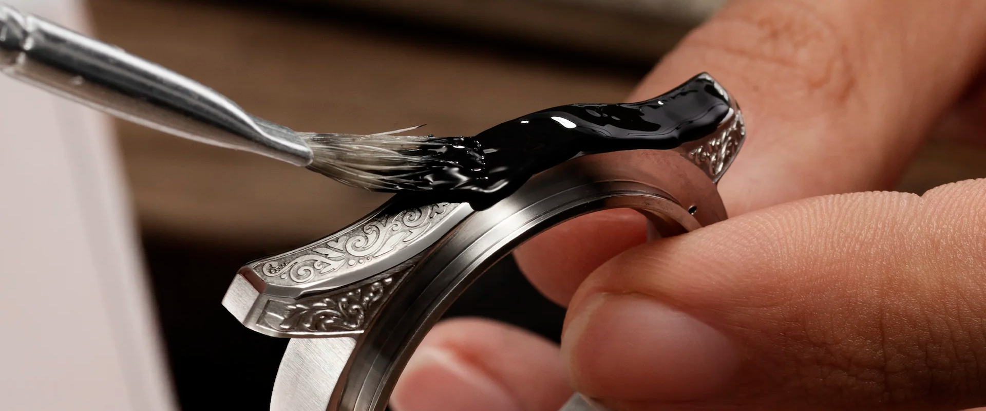 Inspirado na técnica renascentista da acquaforte, o Nereide Acquaforte apresenta uma caixa finamente gravada com motivos de folhas de acanto, símbolo eterno de beleza e harmonia da arte clássica. O mostrador minimalista em preto fosco, realçado por índices polidos e Super-LumiNova® Swiss preta que emite um brilho verde sutil, cria um equilíbrio perfeito entre estética neoclássica e funcionalidade moderna.