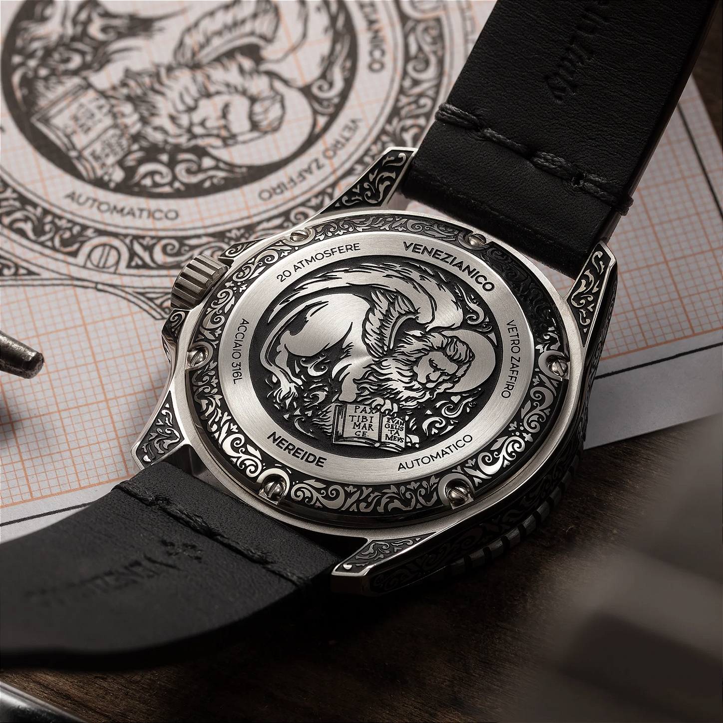 A gravação no caseback apresenta o icônico Leão de São Marcos com a inscrição "Pax Tibi Marce Evangelista Meus" (Paz seja contigo, Marcos, meu evangelista), símbolo máximo do poder e da sabedoria da República de Veneza. Por séculos, este leão alado apareceu em moedas, bandeiras e obras de arte, representando a força e a proteção da Sereníssima.