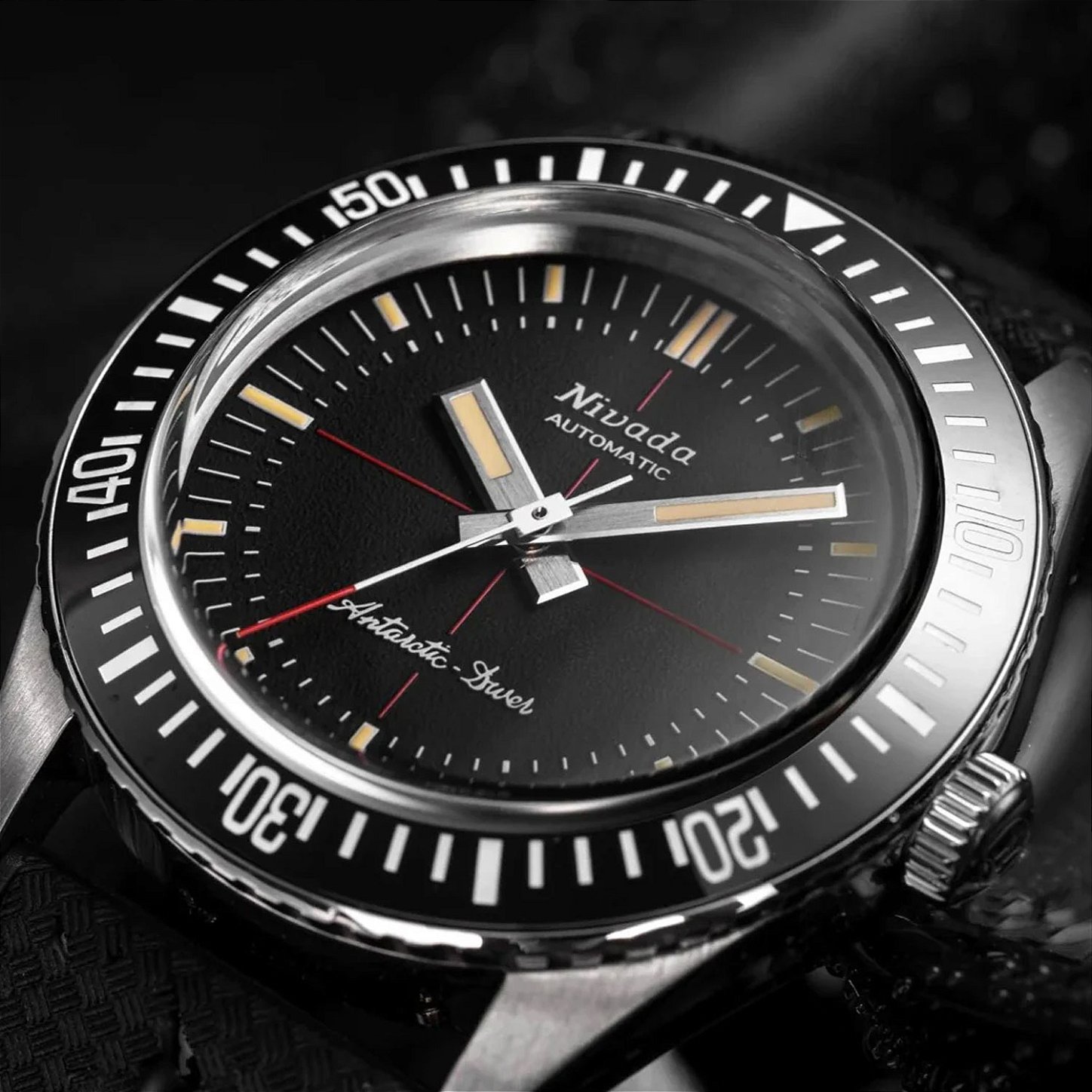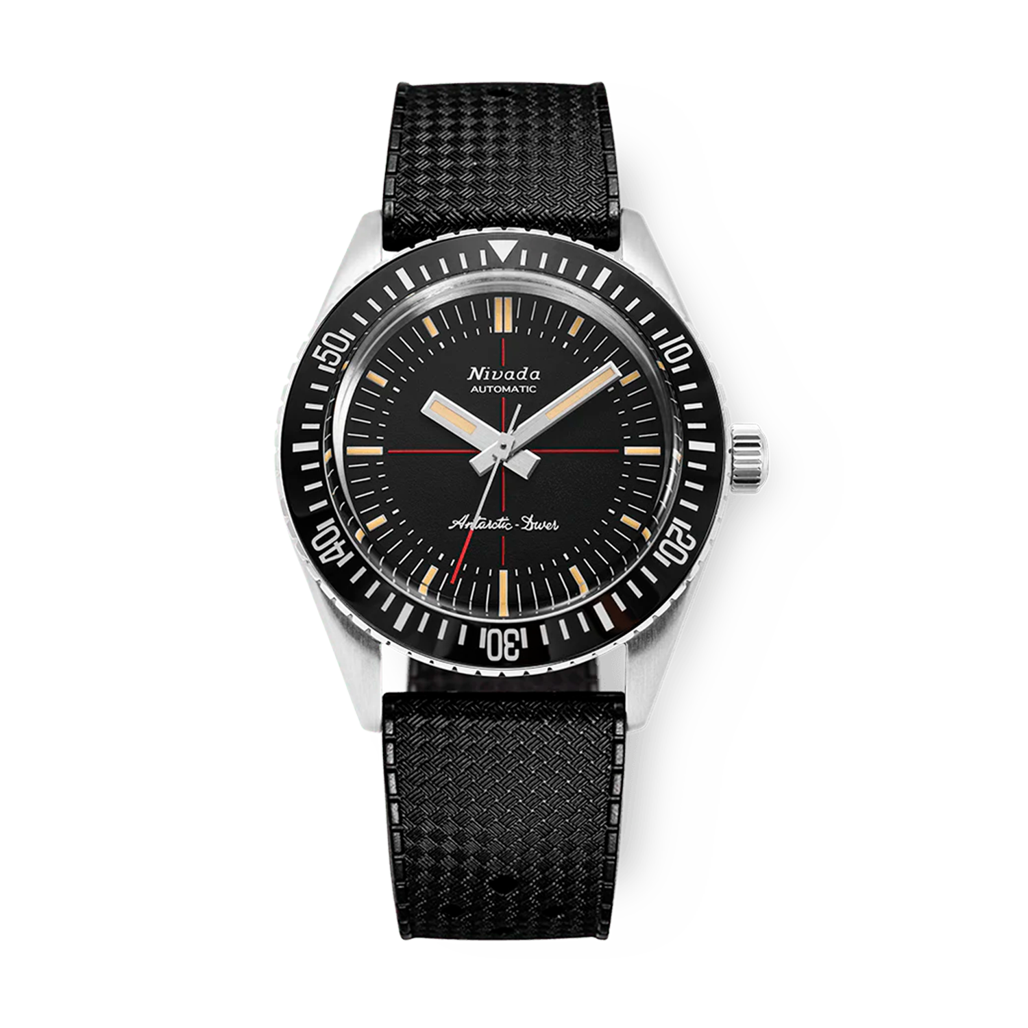 Renascido das profundezas dos anos 50, o Nivada Grenchen Antarctic Diver traz a elegância vintage dos skin divers originais com tecnologia suíça moderna. Seu mostrador negro texturizado com cruzes vermelhas discretas e ponteiros cream latte patinad recreiam fielmente a estética icônica que conquistou mergulhadores e exploradores da era dourada. O bezel cerâmico bidirecional e a caixa compacta de 38mm oferecem funcionalidade autêntica sem ostentação.