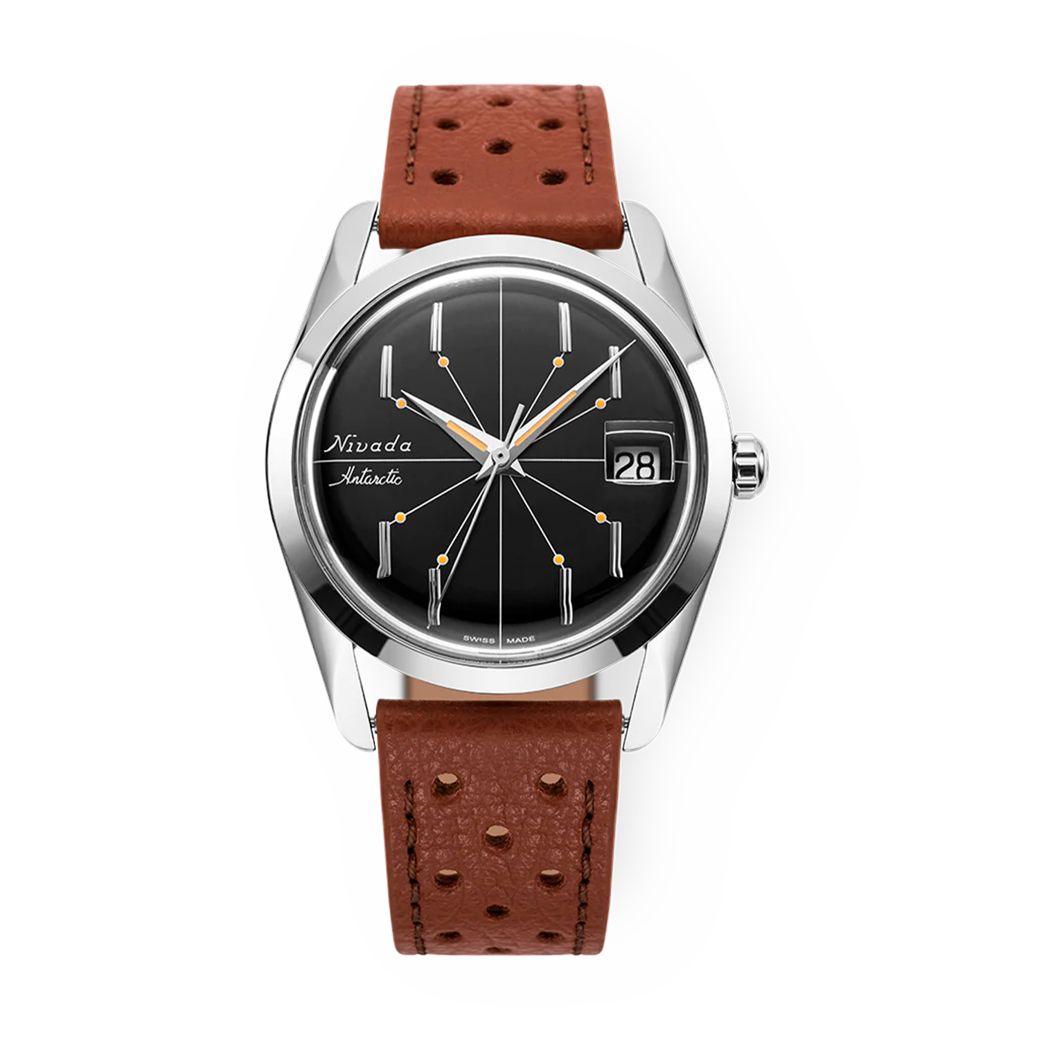 Renascido das profundezas do passado, o Nivada Grenchen Antarctic Spider Black 35mm traz de volta o design mais excêntrico e gráfico dos anos 70. Com seu mostrador sunray preto caracterizado por 8 linhas radiais que se conectam aos índices aplicados - formando a famosa "aranha" que dá nome ao modelo - este relógio é uma obra-prima de originalidade que polariza e fascina. Cada elemento do mostrador sunray é uma declaração visual única, protegida por cristal safira dupla-cúpula de dureza quase diamantina.