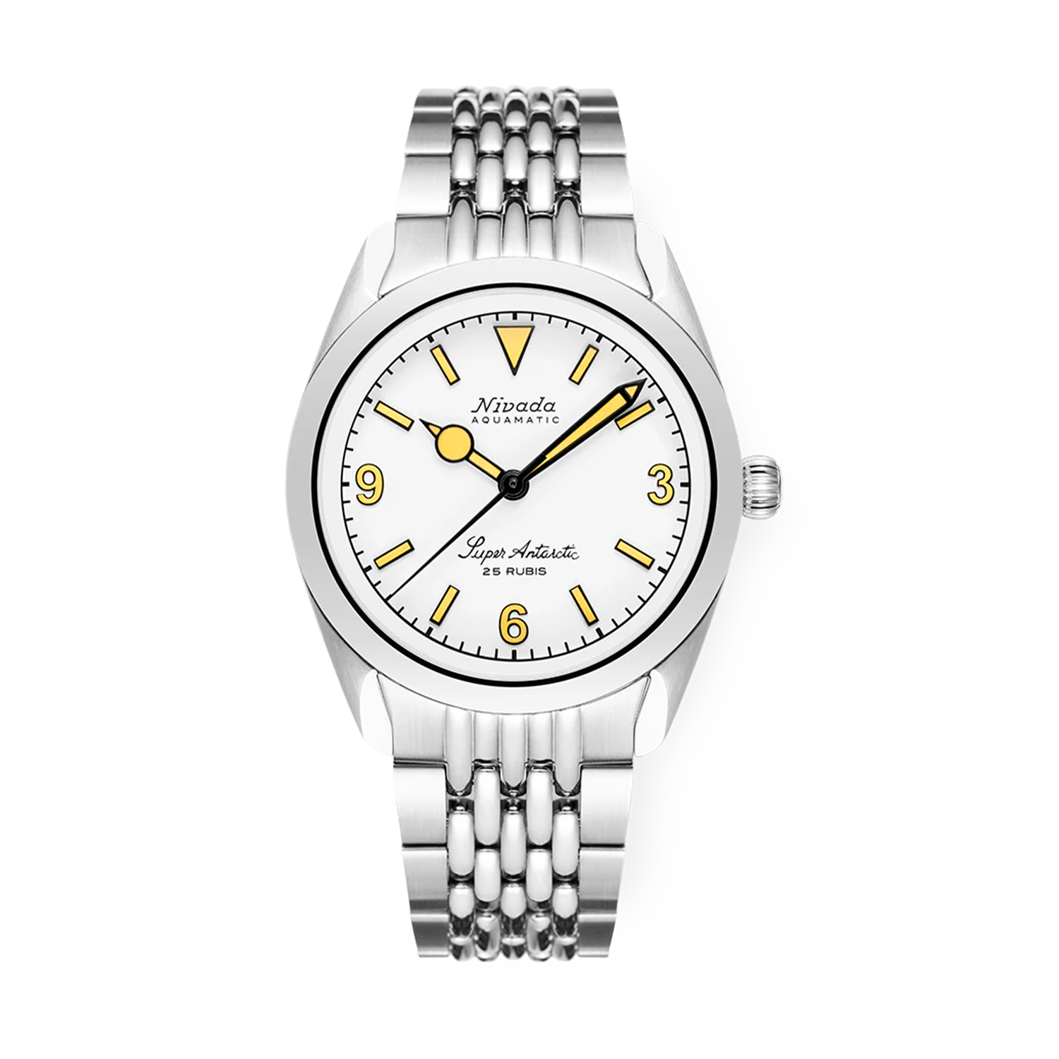 Tributo ao espírito de exploração polar, o Super Antarctic White 3.6.9 de 38mm é uma reedição fiel do icônico modelo usado pela Marinha Americana na Operação Deep Freeze I (1955-56). O mostrador branco pristino com numerais creme evoca a pátina dos instrumentos vintage, enquanto o cristal de safira dupla curvatura e coroa rosqueável garantem modernidade e robustez para aventuras contemporâneas.