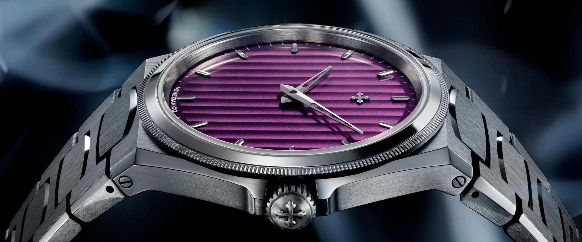 Inspirado no histórico Arsenale de Veneza, este relógio representa a fusão perfeita entre tradição veneziana e design moderno. O mostrador com acabamento vertical Côtes de Genève criado por escovas rotativas cria ondas delicadas que conferem profundidade e brilho únicos, enquanto os ponteiros dauphine esqueletonizados e índices baton completam a estética refinada da relojoaria clássica.
