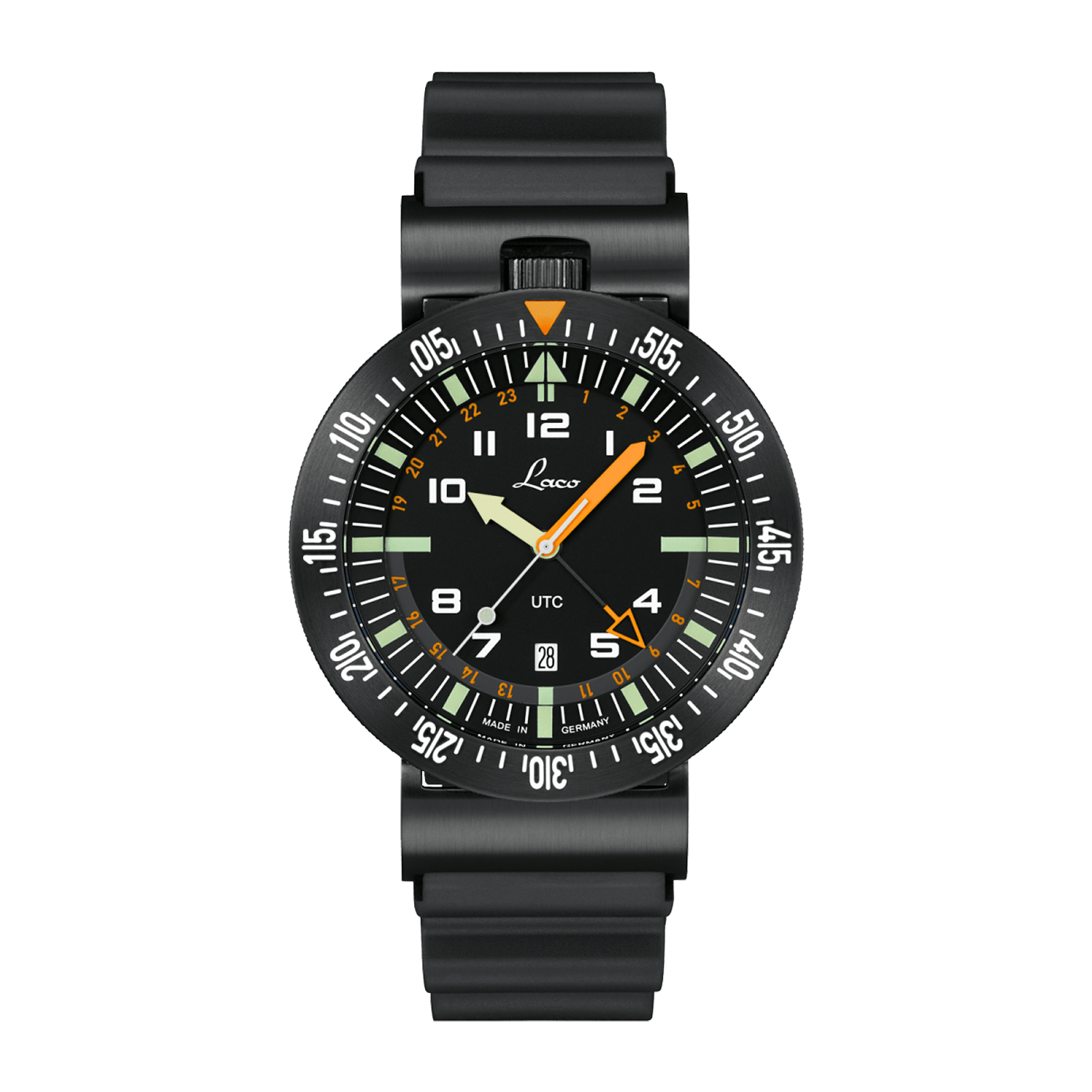 Desenvolvido em colaboração com bombeiros, polícia e forças armadas, o Laco Atacama Quartz UTC combina robustez alemã com funcionalidade tactical. O mostrador mate negro com índices luminosos e numeração 1-23 laranja para segundo fuso horário oferece legibilidade máxima em condições extremas, enquanto o revestimento PVD negro e bezel countdown unidirecional garantem resistência e precisão operacional.