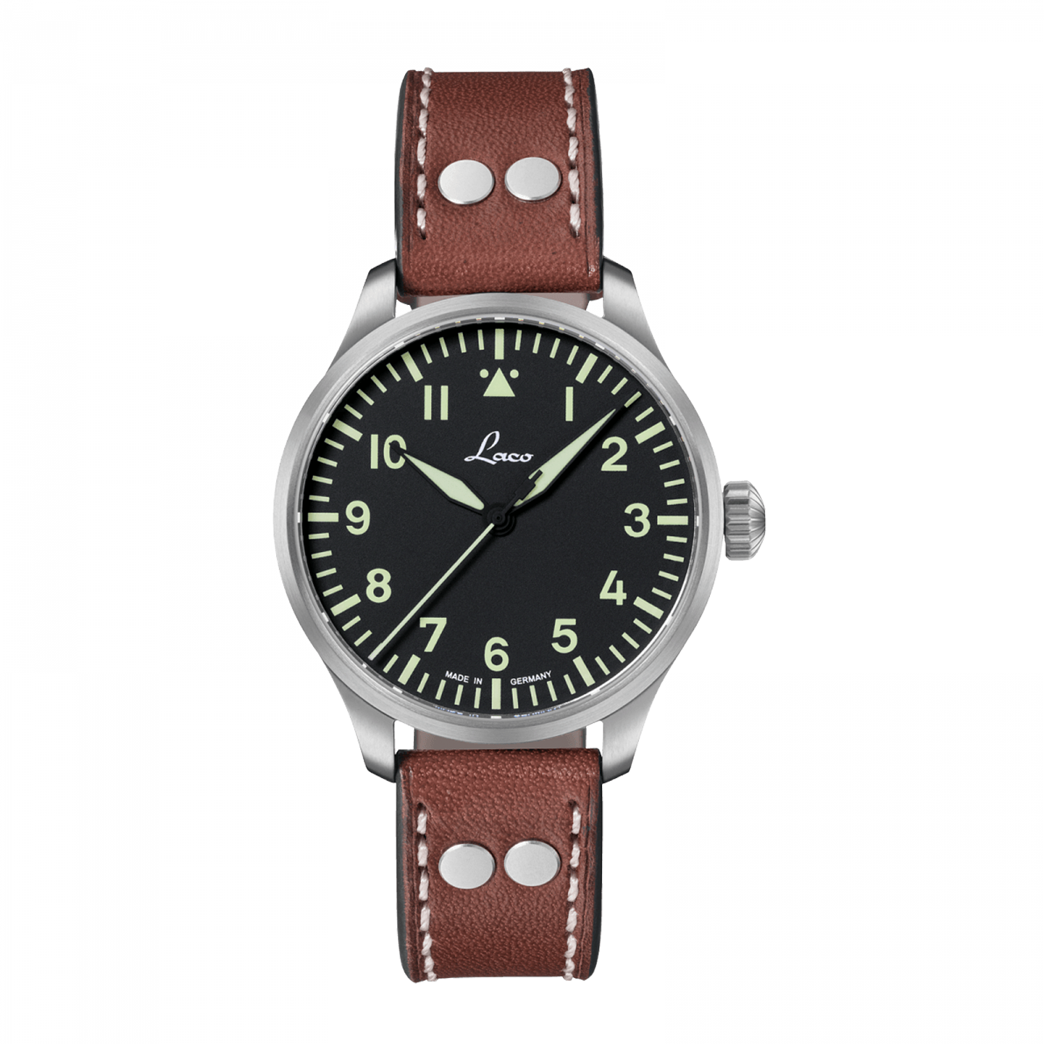 TRADIÇÃO LACO: Desde 1925, a Laco produz relógios de navegação aérea na tradição de Pforzheim. Este Augsburg carrega a herança dos primeiros fliegers alemães, quando a legibilidade era questão de vida ou morte nos céus europeus.