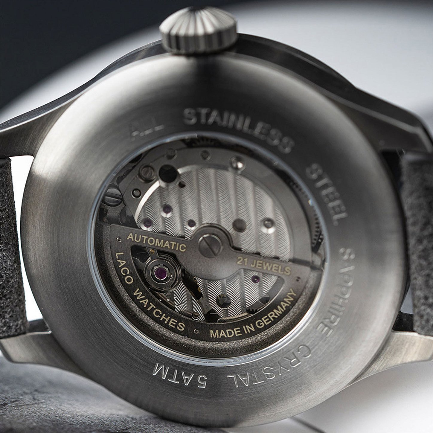 MOVIMENTO LACO 2S: baseado no robusto Miyota 82S0, o calibre recebe acabamentos especiais da Laco, incluindo cortes ornamentais e ajuste de precisão. Com 42 horas de reserva de marcha e função de parada de segundos, oferece a funcionalidade técnica exigida pelos pilotos originais.
