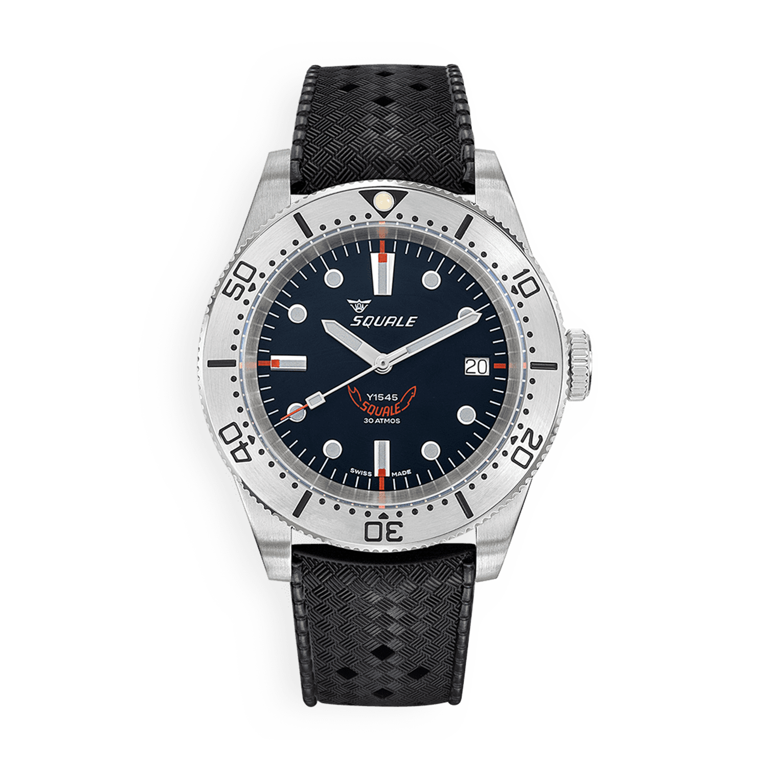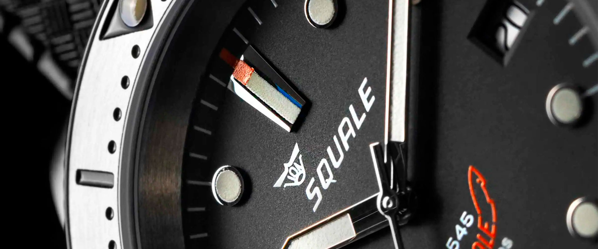 O mostrador do 1545 carrega duas assinaturas Squale distintas: o logo curvado aos 6 horas representa a era dourada em que a marca produzia cases para dezenas de outras fabricantes, enquanto o logo coroado aos 12 horas simboliza a identidade própria conquistada ao longo das décadas.