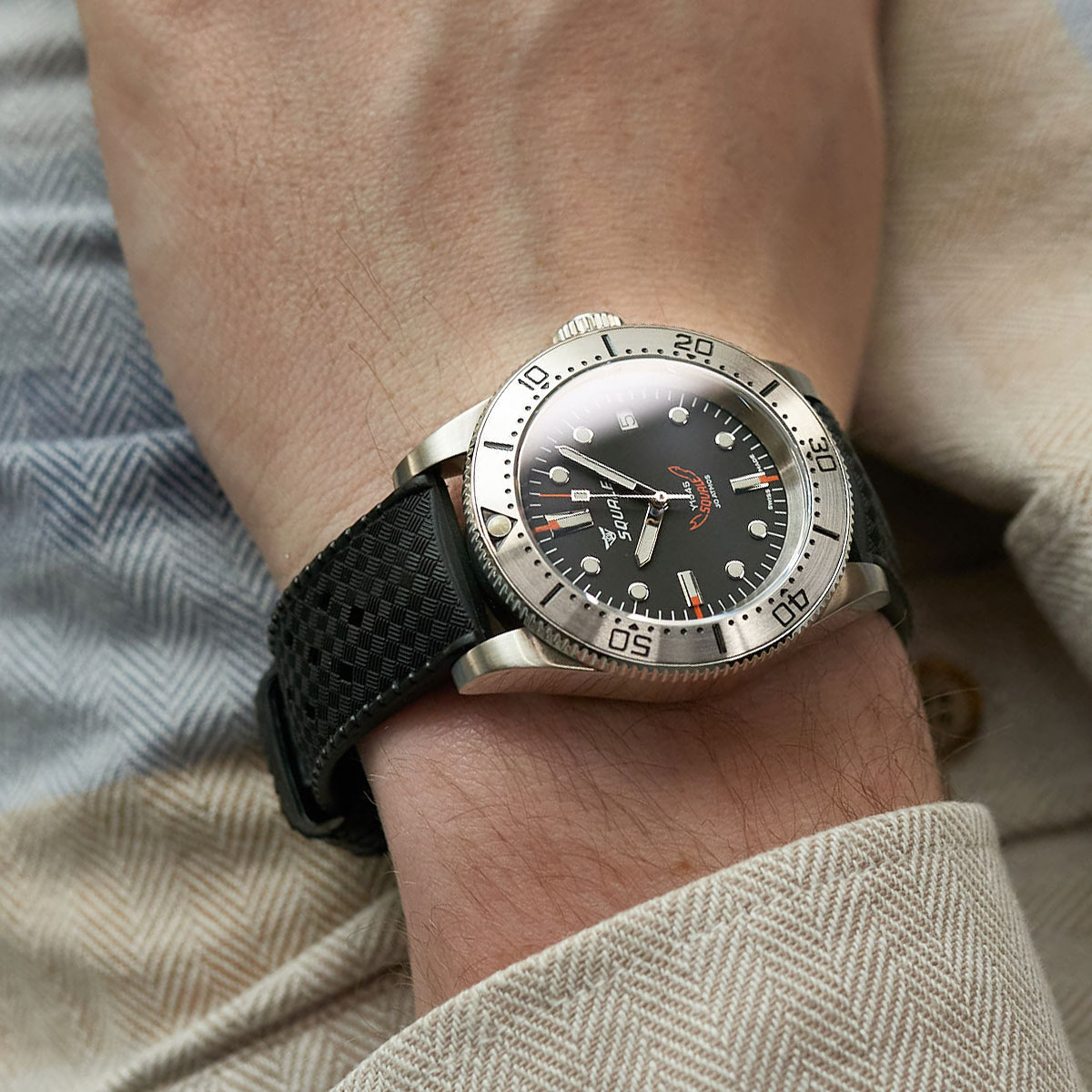 Equipado com o confiável movimento automático Sellita SW 200-1 e resistência de 20 ATM, o modelo mantém o perfil compacto de 12mm sem comprometer a funcionalidade. A pulseira de borracha preta integrada oferece conforto superior durante atividades aquáticas, enquanto os índices aplicados com Super-LumiNova C1 garantem legibilidade excepcional em condições de baixa luminosidade.