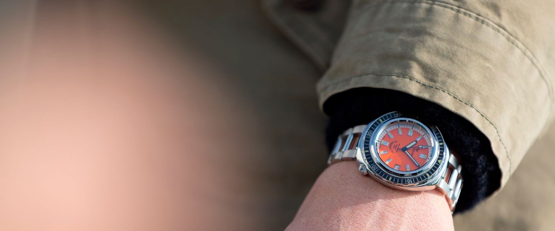 MOSTRADOR REVERSE ORANGE: a cor laranja vibrante não é apenas estética - historicamente usada em equipamentos de mergulho profissional por sua alta visibilidade subaquática. O acabamento fosco reduz reflexos indesejados, enquanto os índices aplicados com SuperLuminova C3 garantem legibilidade em qualquer condição de luminosidade.