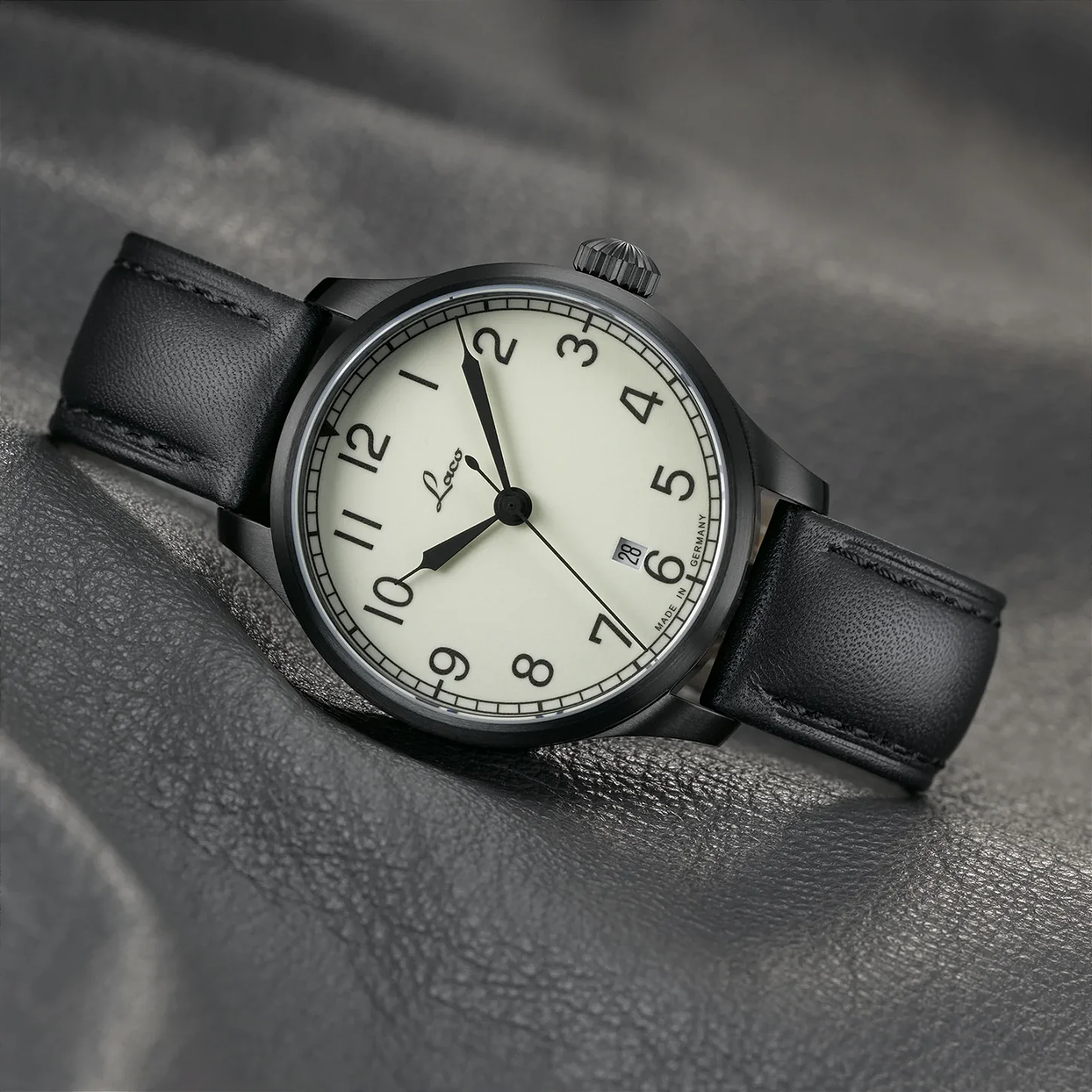 O movimento automático Laco 21 (base Miyota 8217) e o cristal de safira com fundo transparente revelam a mecânica precisa em uma caixa compacta de 39mm. A pulseira de couro vintage natural garante que cada unidade seja única, refletindo a filosofia alemã de que a verdadeira qualidade se revela com o tempo.