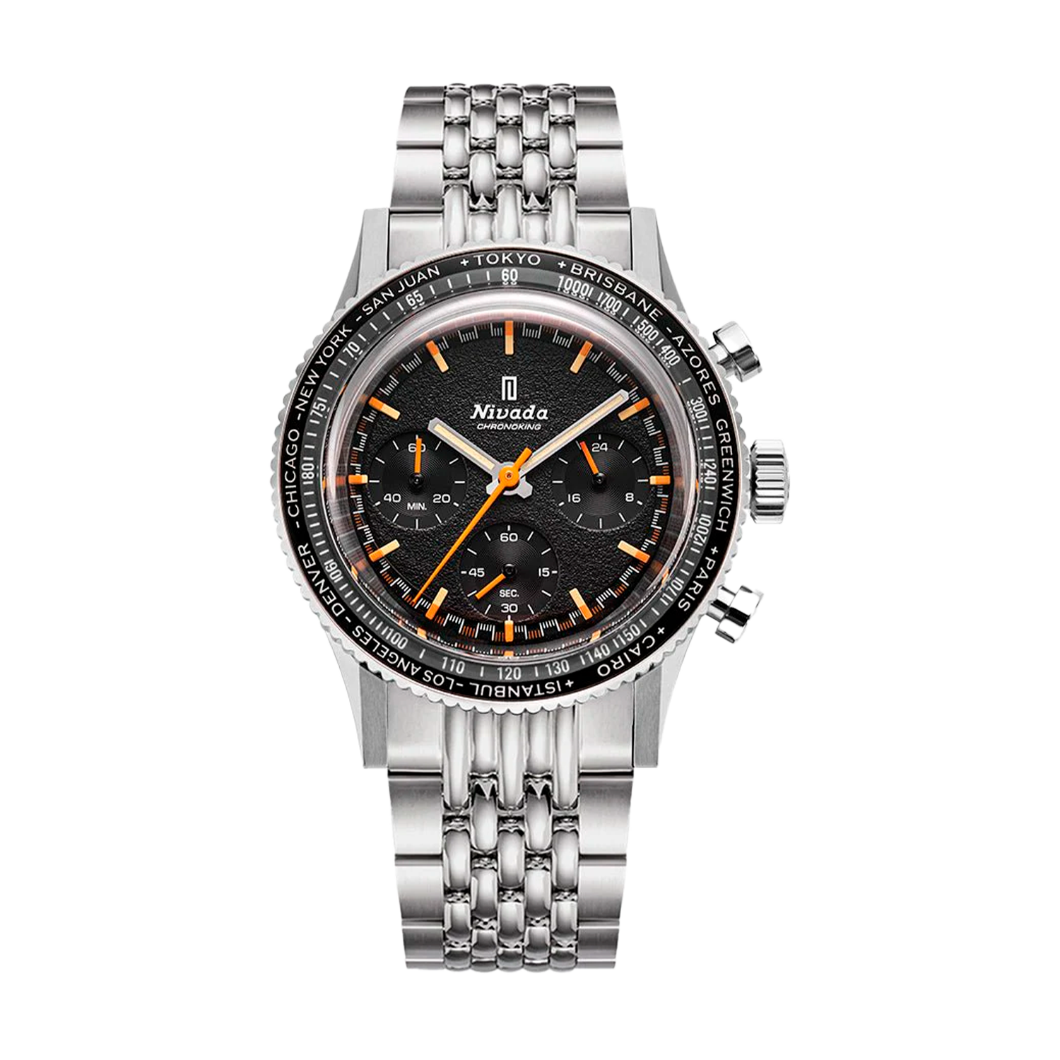 O Chronoking Mecaquartz 87042Q04 eleva a experiência vintage racing com seu bracelete three-link de aço inoxidável 316L, criando uma unidade visual perfeita entre caixa e pulseira. Este cronógrafo de 38mm combina a revolução dos bezéis intercambiáveis com a elegância duradoura do aço, oferecendo versatilidade estética sem comprometer a autenticidade setentista. O movimento VK63A mecaquartz mantém a precisão quartz com a suavidade mecânica, enquanto o mostrador texturizado preto mate com índices laranja vibrantes captura a essência dos chronographs de corrida clássicos.