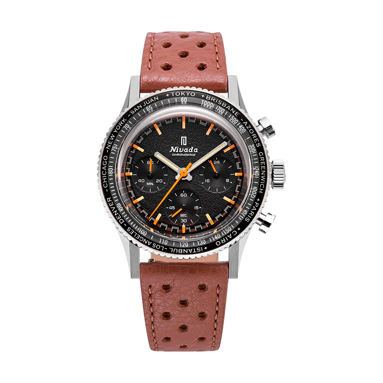 A escolha pelo couro marrom racing não é nostálgica - é estratégica. Esta tonalidade desenvolve pátina única ao longo do tempo, tornando cada exemplar verdadeiramente exclusivo. As perfurações estratégicas garantem respirabilidade durante uso intenso, enquanto a textura premium oferece aderência superior. O mostrador texturizado preto mate com índices laranja cria contraste perfeito com o warmth do couro marrom, estabelecendo harmonia visual que honra a golden age do motorsport com elegância contemporânea.