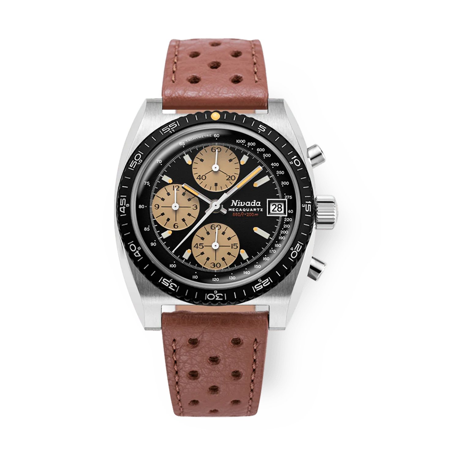 Inspirado no lendário Chronosport dos anos 70, o Nivada Grenchen Autochron Mecaquartz Brown Racing evoca a era dourada do automobilismo com sua distintiva pulseira de couro marrom racing. O modelo combina a precisão do quartzo com a sensação mecânica através do movimento híbrido VK67 Meca-Quartz, onde o cronógrafo se move organicamente, complementado pela elegante pulseira de couro marrom perfurado que desenvolve pátina natural única com o tempo.