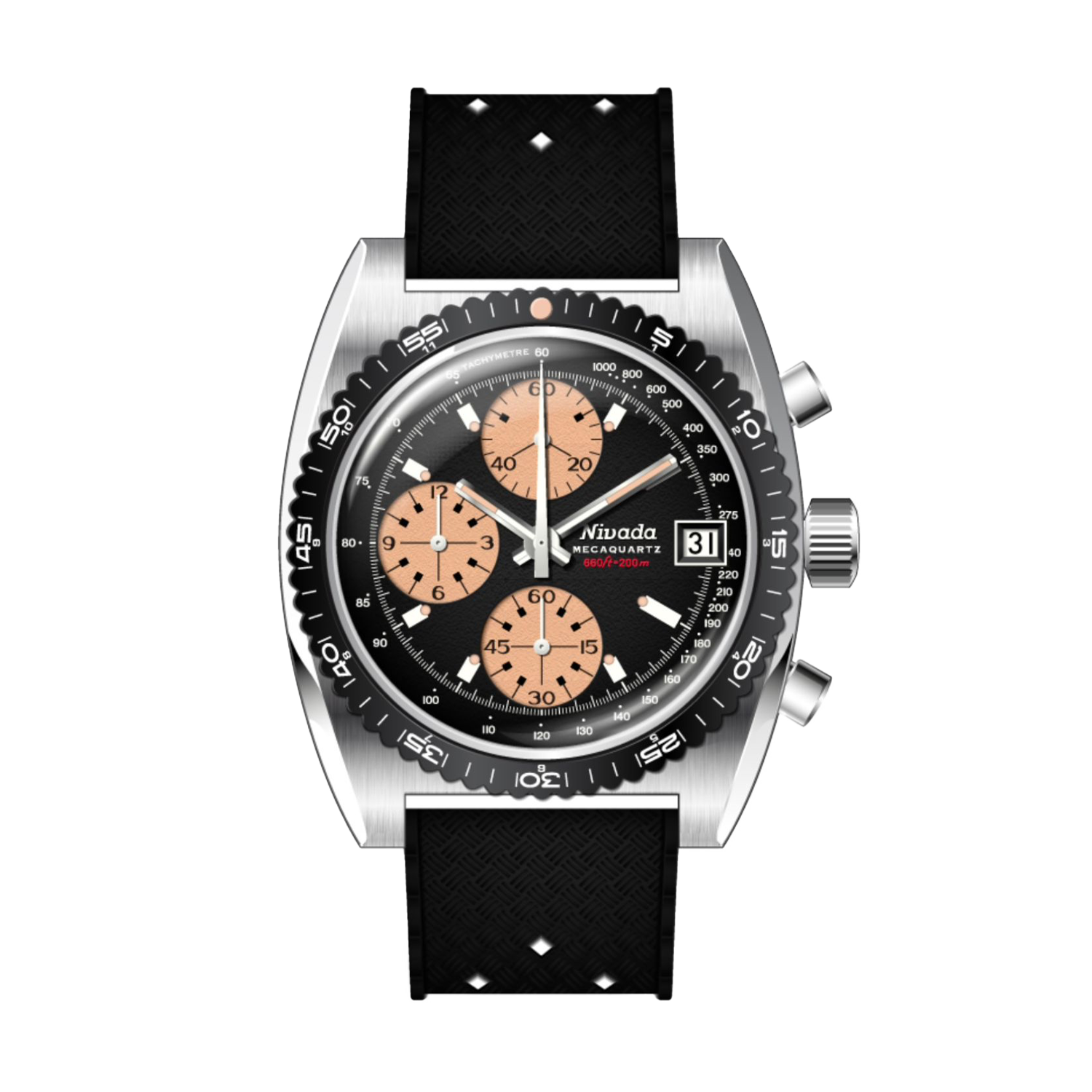Inspirado no lendário Chronosport dos anos 70, o Nivada Grenchen Autochron Mecaquartz Salmon Tropic captura a essência tropical dos cronógrafos vintage com seus distintivos subdiais salmão que evocam pores-do-sol em Mônaco. O modelo combina a precisão do quartzo com a sensação mecânica através do movimento híbrido VK67 Meca-Quartz, complementado pela versátil pulseira de borracha tropic que oferece conforto absoluto em qualquer ambiente.