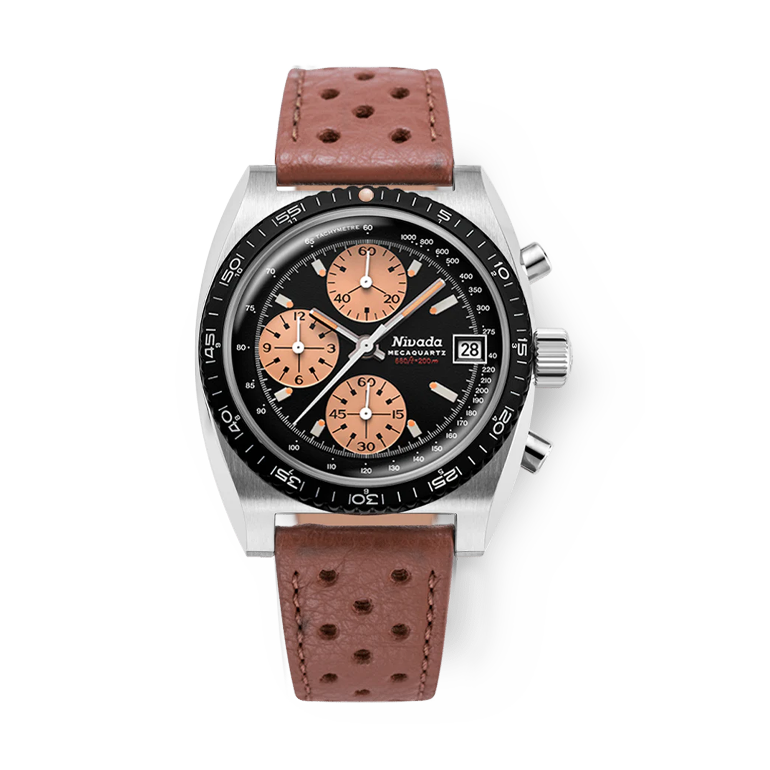 Inspirado no lendário Chronosport dos anos 70, o Nivada Grenchen Autochron Mecaquartz Salmon Brown Racing celebra a era dourada do automobilismo através da harmoniosa combinação entre os subdiais salmão vibrantes e a autêntica pulseira de couro marrom racing. Este modelo combina a precisão do quartzo com a sensação mecânica através do movimento híbrido VK67 Meca-Quartz, complementado pela vintage pulseira de couro marrom perfurado que desenvolve pátina natural única, evocando os interiores dos carros esportivos clássicos.