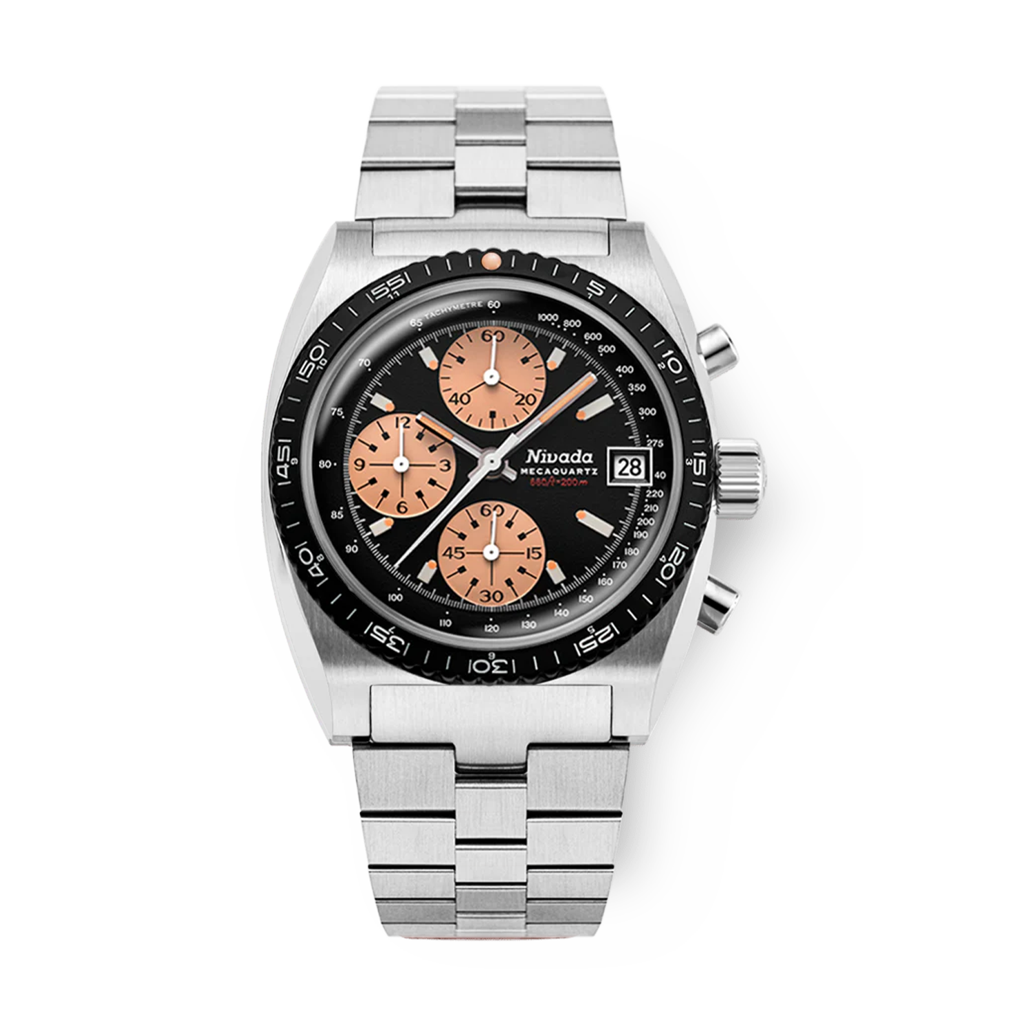 Inspirado no lendário Chronosport dos anos 70, o Nivada Grenchen Autochron Mecaquartz Salmon Steel representa a evolução moderna desta icônica coleção com seus distintivos subdiais salmão que evocam pores-do-sol em circuitos lendários. Este modelo combina a precisão do quartzo com a sensação mecânica através do movimento híbrido VK67 Meca-Quartz, complementado pelo sofisticado bracelete de aço com elos flat links que oferece durabilidade absoluta e elegância urbana contemporânea.