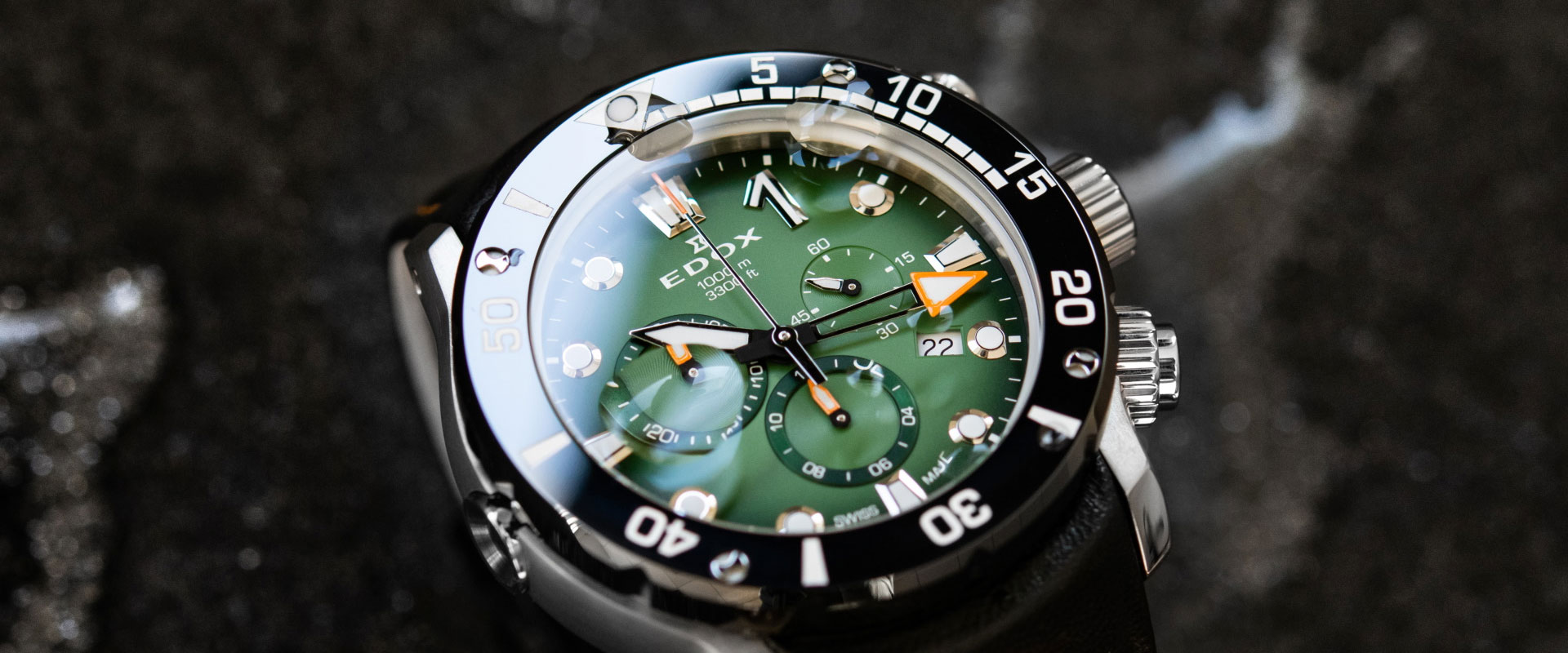 Equipado com movimento quartzo suíço Ronda 5030.D e cristal de safira, o modelo oferece resistência excepcional de 100 ATM (1000 metros) e funcionalidade cronógrafo completa. A pulseira de couro com costuras contrastantes e o revestimento Super-LumiNova garantem legibilidade total mesmo nas profundezas mais desafiadoras.