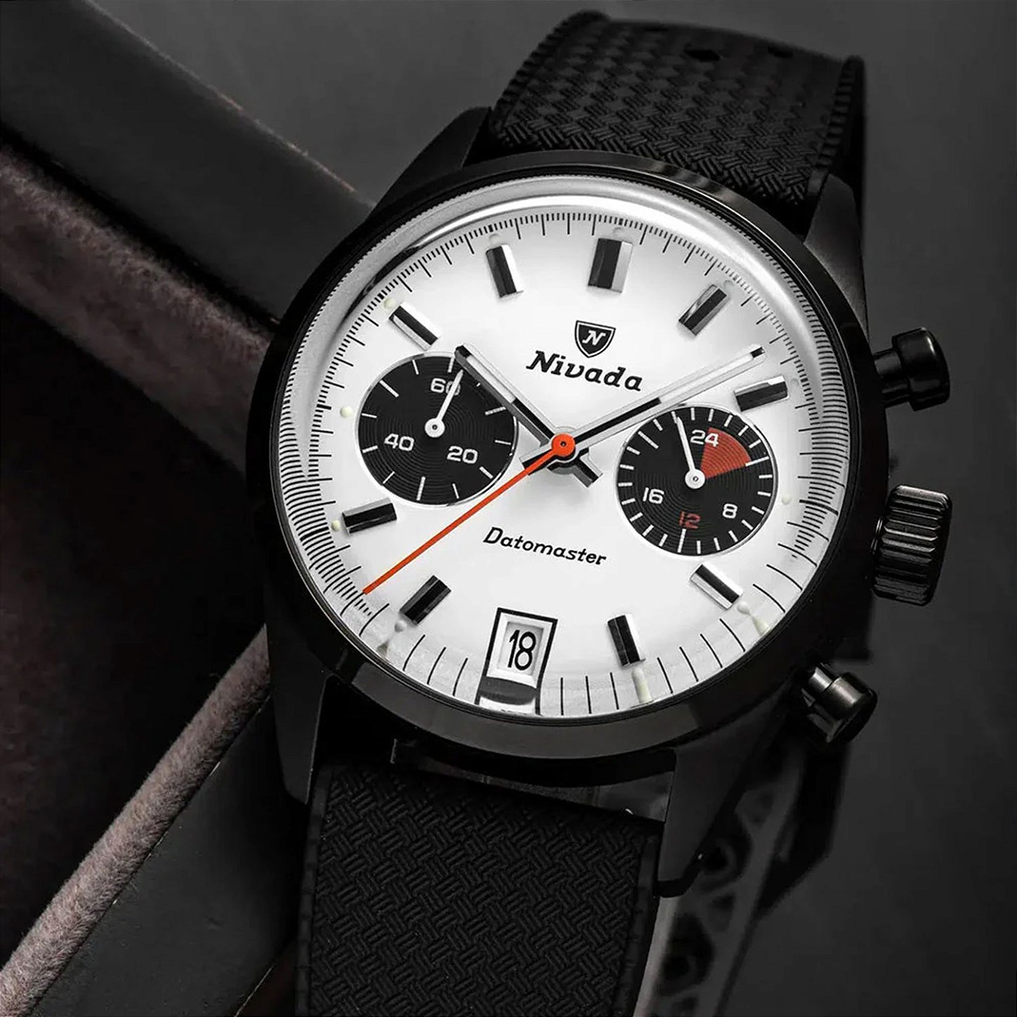Limitado a 500 unidades mundialmente, o Datomaster combina o charme nostálgico de um cronógrafo manual dos anos 60 com a praticidade e precisão de um movimento híbrido Seiko VK64. Com 12mm de espessura total e resistência de 100 metros, este relógio é versátil o suficiente para uso diário - da praia ao escritório casual. A pulseira Tropic preta com textura waffle é um tributo aos cronógrafos de mergulho vintage, complementando perfeitamente o mostrador branco luminoso. Montado na Suíça, representa o renascimento bem-sucedido de uma marca histórica que soube honrar seu legado com inovação.