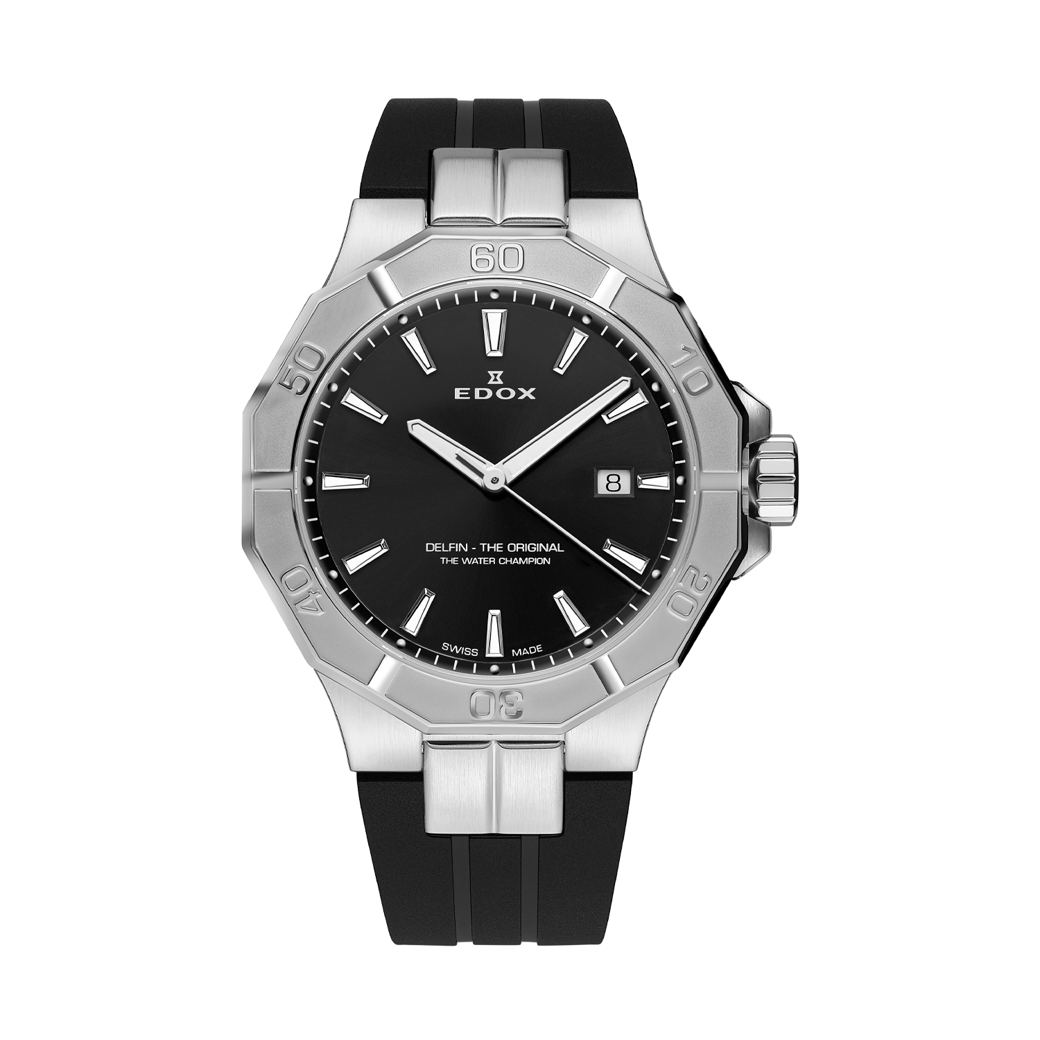 O Edox Delfin Date é um mergulhador clássico suíço que combina herança aquática com versatilidade urbana. Com mostrador preto contrastante, luminescência Super-LumiNova e vidro safira antirreflexo, oferece legibilidade excepcional tanto na superfície quanto nas profundezas. Suas linhas esportivas e acabamento premium refletem décadas de expertise em cronometragem aquática desde 1961.