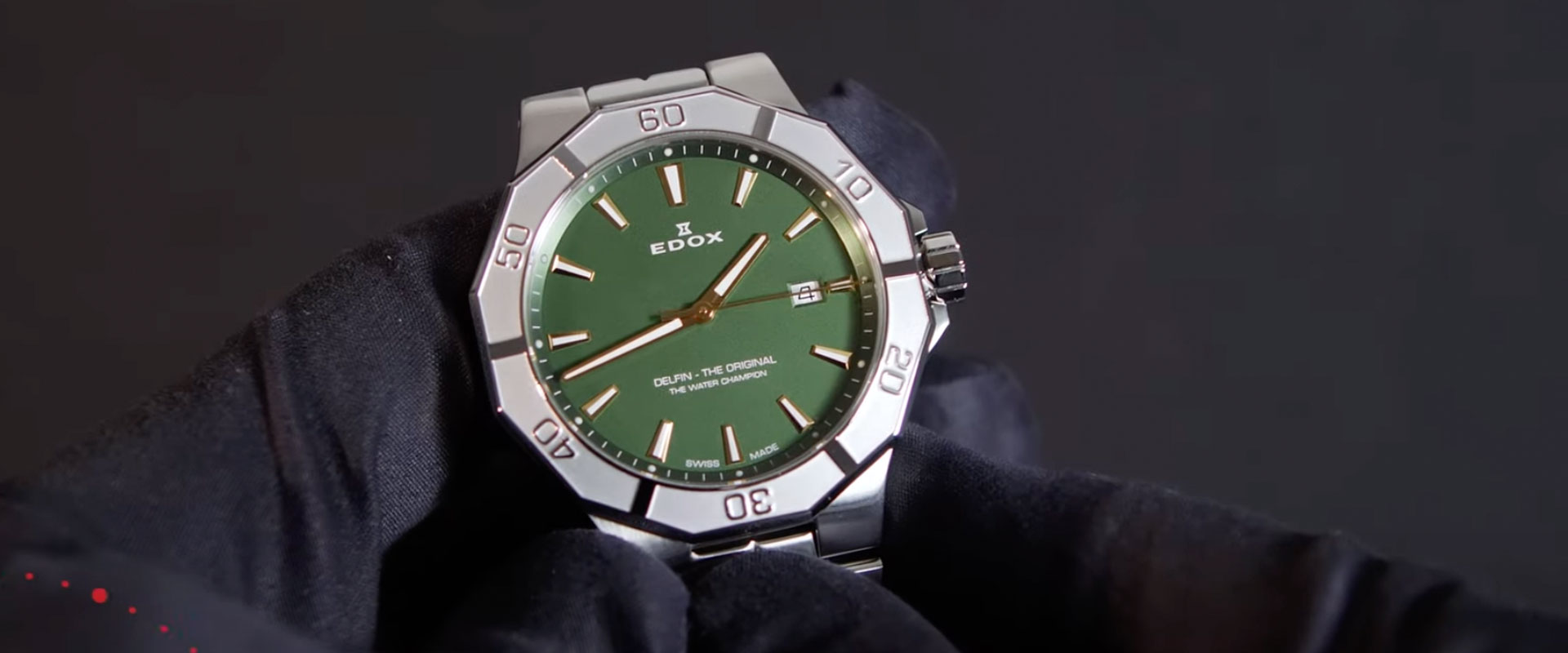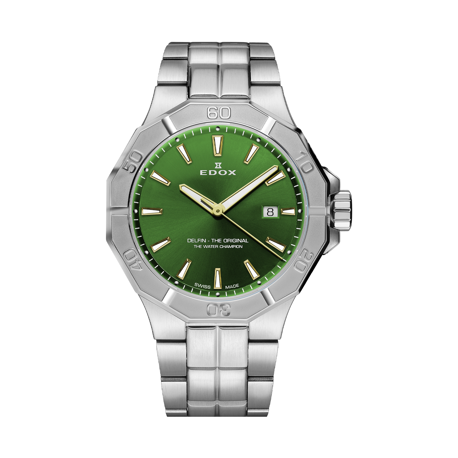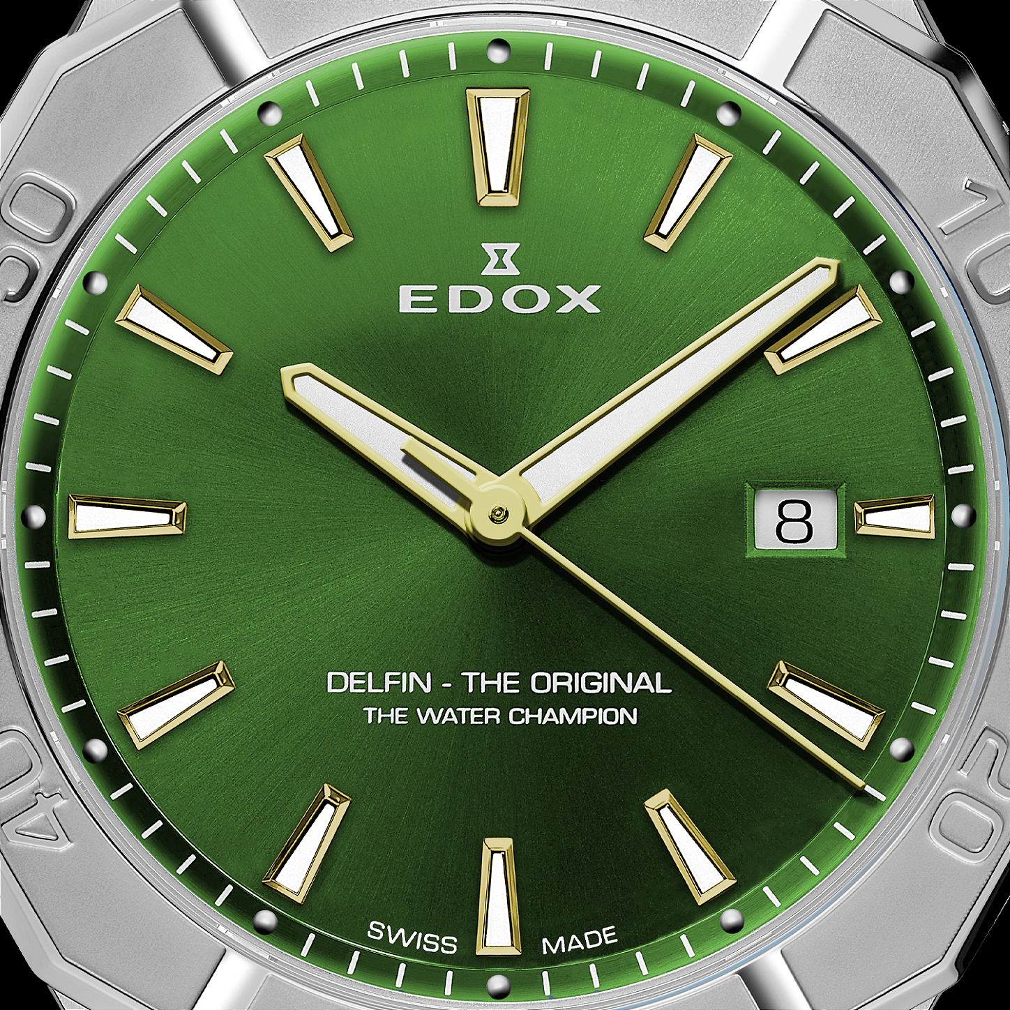 Inspirado na tradição suíça de precisão subaquática, o Edox Delfin Date combina o icônico sistema Double O'ring com design dodecagonal moderno. Seu mostrador violeta profundo contrasta elegantemente com os índices Super-LumiNova, criando uma presença visual marcante que honra mais de 60 anos de herança em relógios de mergulho. O bezel graduado de 60 minutos e a caixa de 43mm em aço 316L garantem funcionalidade técnica sem comprometer a elegância urbana.