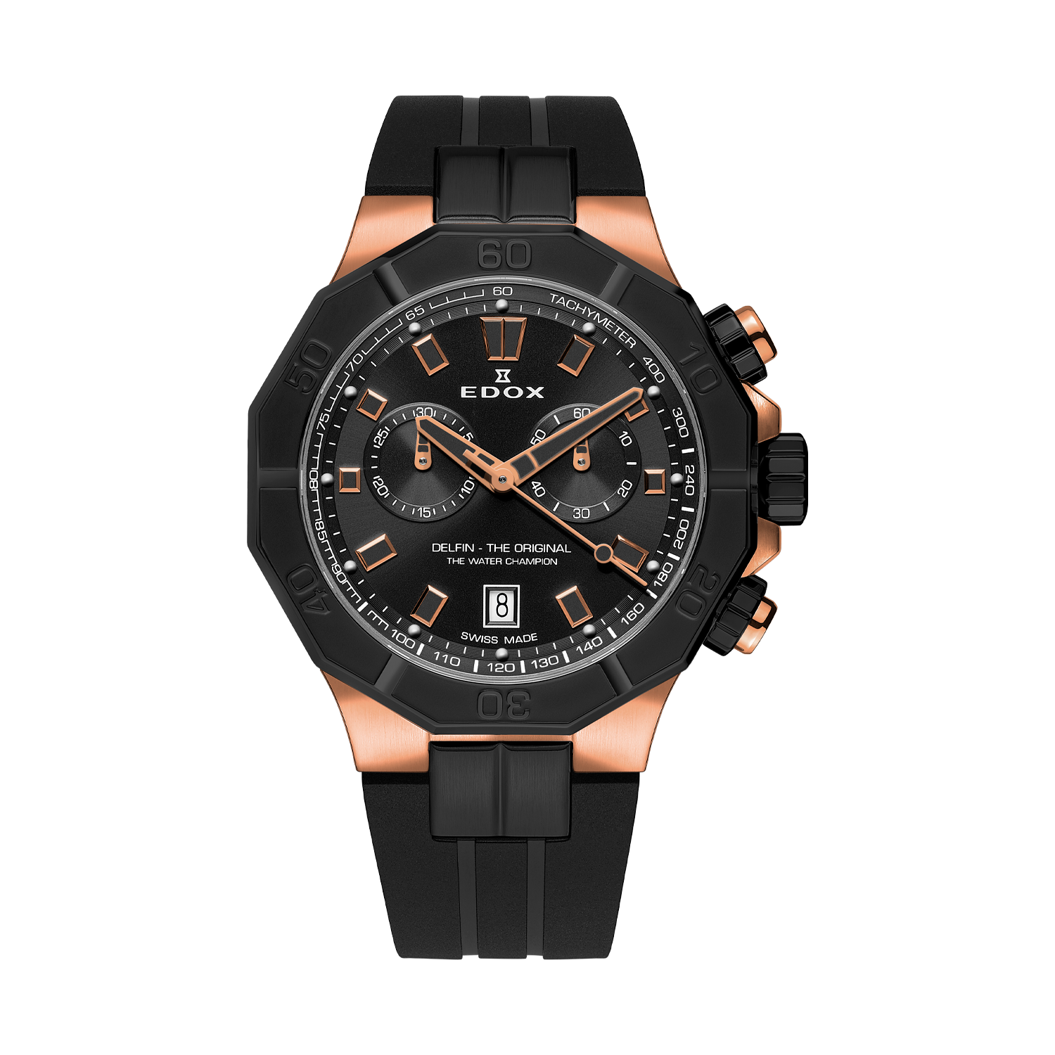 Resgatando a lenda dos relógios de mergulho que nasceram em 1961, o Edox Delfin The Original Chronograph combina o icônico sistema duplo O-ring com as linhas elegantes de um cronógrafo esportivo moderno. Seu mostrador preto radiante contrasta com o revestimento PVD rose gold, criando uma estética sofisticada que honra a tradição suíça de inovação subaquática. O taquímetro integrado ao bezel dodecagonal oferece funcionalidade técnica para medições de velocidade com precisão cronométrica.