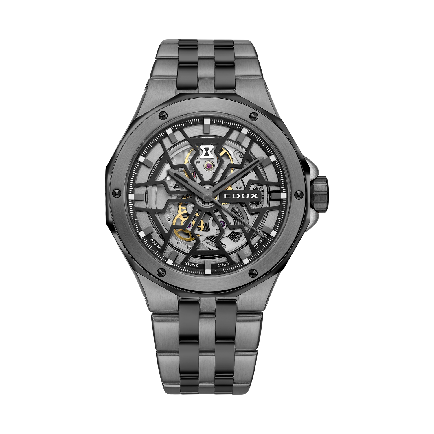 O Edox Delfin Mecano Automatic 43mm representa a evolução contemporânea de uma linhagem histórica de 70 anos. Com mostrador skeleton que revela o movimento automático Sellita SW200, este relógio de mergulho combina a tradição relojoeira suíça com design arrojado e funcionalidade extrema. O revestimento PVD e a pulseira integrada de borracha conferem modernidade ao icônico bezel dodecagonal de 12 faces, marca registrada da família Delfin desde os anos 1970.