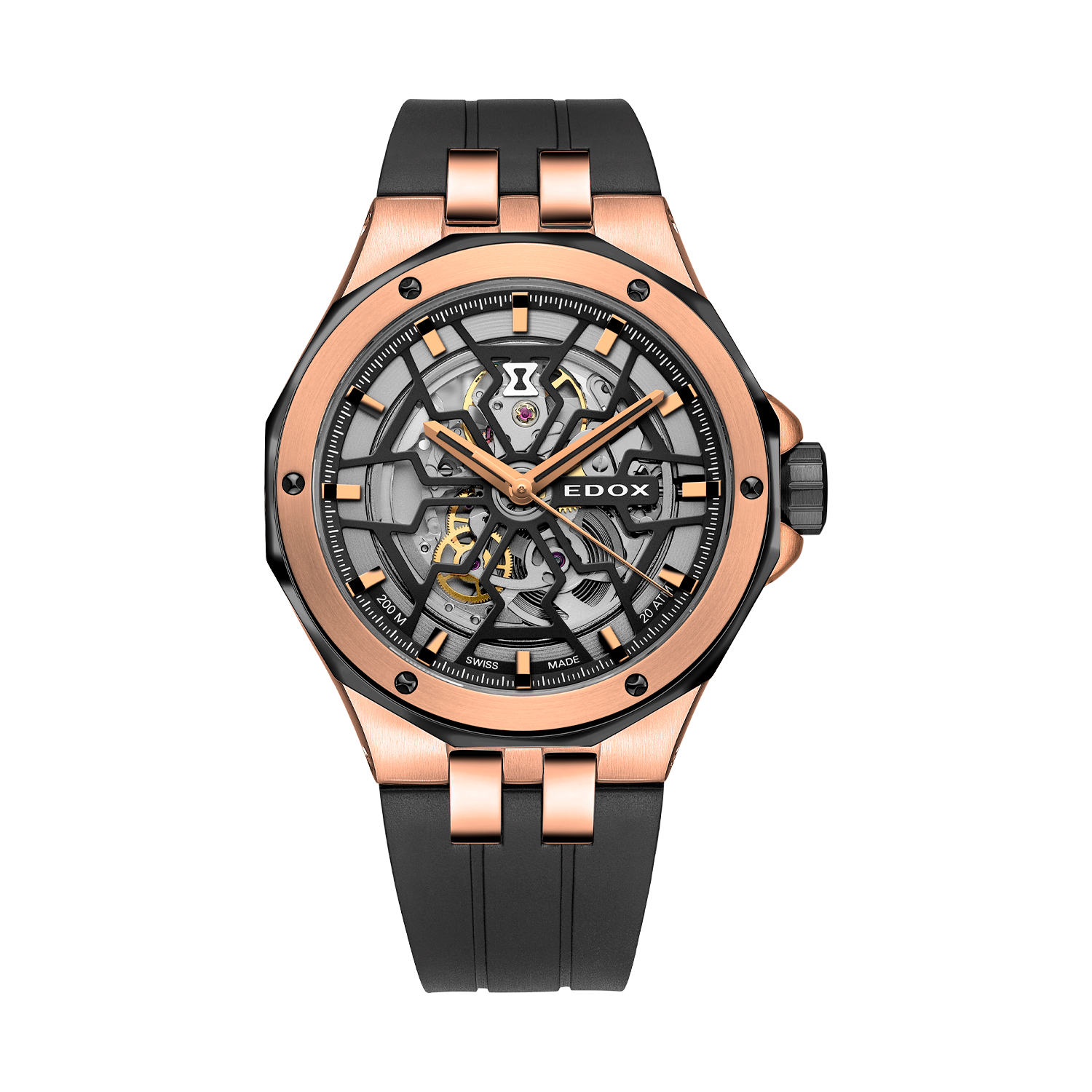 DUPLA VEDAÇÃO EDOX: sistema patenteado de coroa com duplo O-ring garante resistência de 200 metros, estabelecendo novos padrões de proteção para relógios esqueletizados. Tecnologia desenvolvida desde os anos 70 pela Edox especificamente para mergulhadores profissionais.