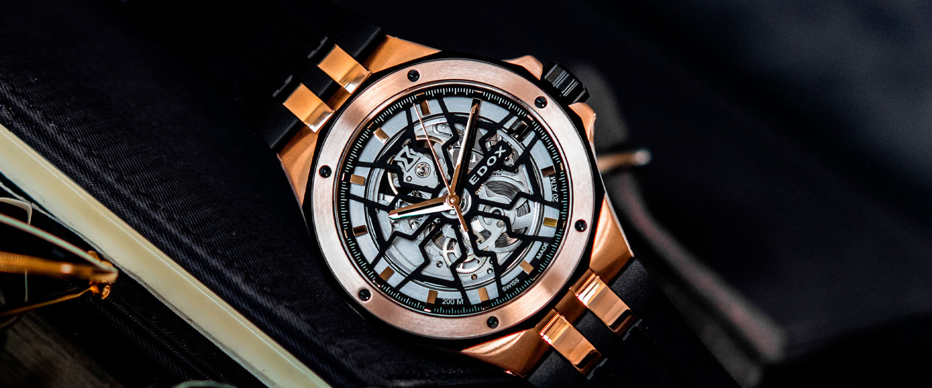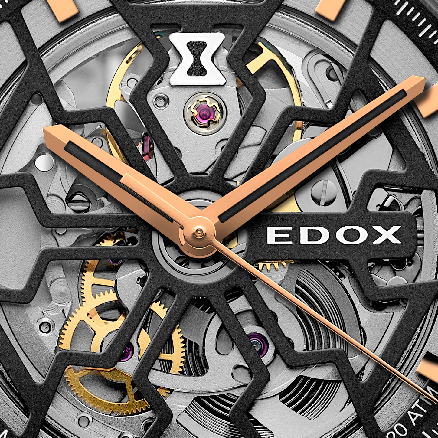 O Edox Delfin Mecano Automatic revela a engenharia suíça em sua forma mais audaciosa, com mostrador esqueletizado que expõe a beleza do movimento Sellita SW200. O acabamento rose gold PVD da caixa de 43mm contrasta elegantemente com o mostrador preto transparente, enquanto o bezel dodecagonal texturizado resgata o design icônico da linha Delfin dos anos 70. Uma fusão perfeita entre tradição relojoeira e estética contemporânea.