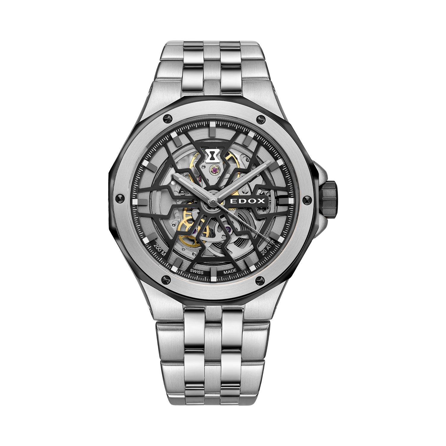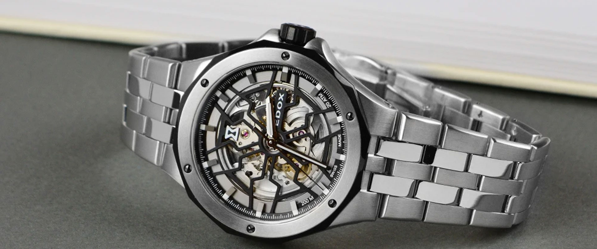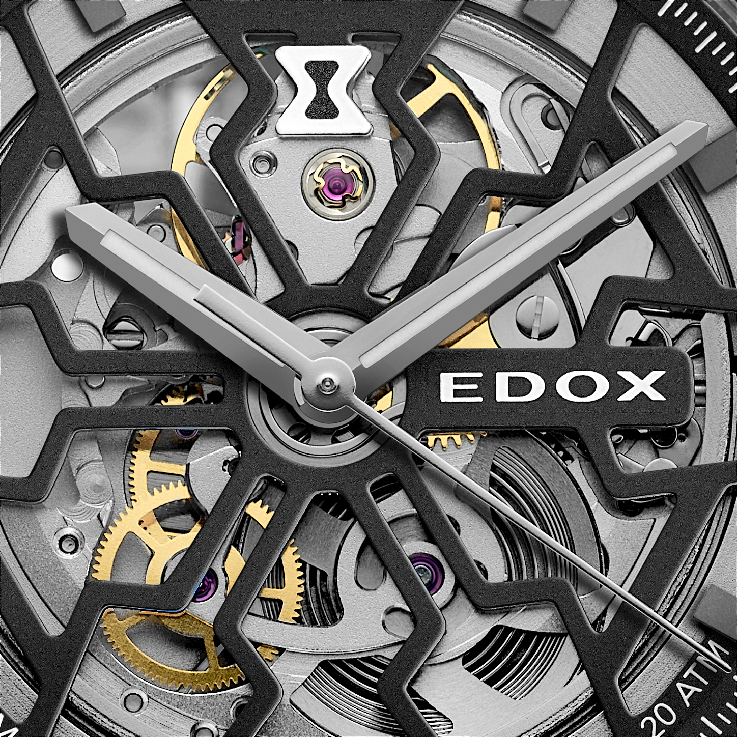 DUPLA VEDAÇÃO EDOX: a coroa com sistema duplo O'ring é uma inovação patenteada da Edox desde os anos 70, garantindo resistência superior à pressão aquática. Este sistema exclusivo permite manter os 200 metros de resistência mesmo com o design complexo do skeleton.