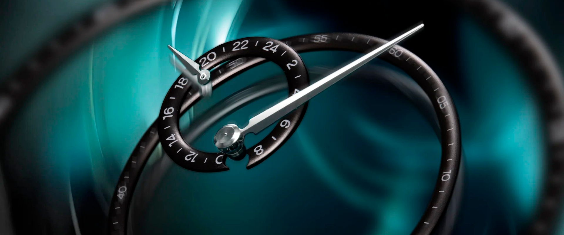 CONSTRUÇÃO MULTINÍVEL: o mostrador cyan fumé esconde complexidade excepcional. Base em latão com acabamento soleil, recessos circulares usinados CNC e anéis abobadados montados artesanalmente garantem perfeito alinhamento. Cada peça passa por múltiplas etapas de acabamento para alcançar a profundidade visual única.