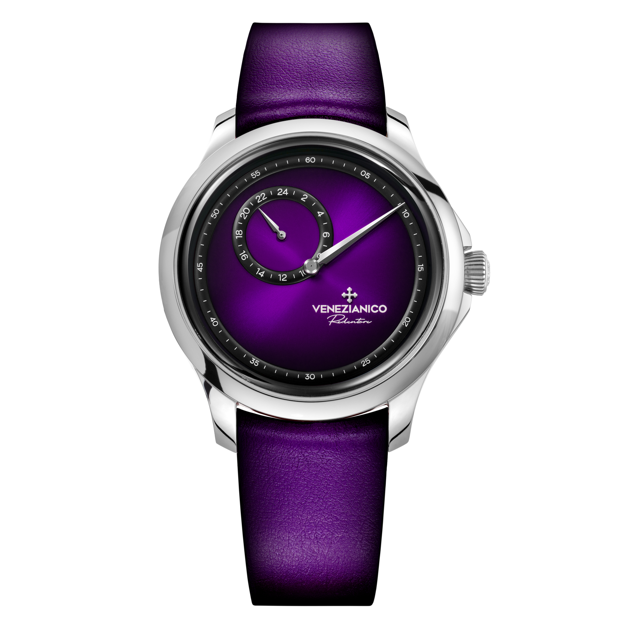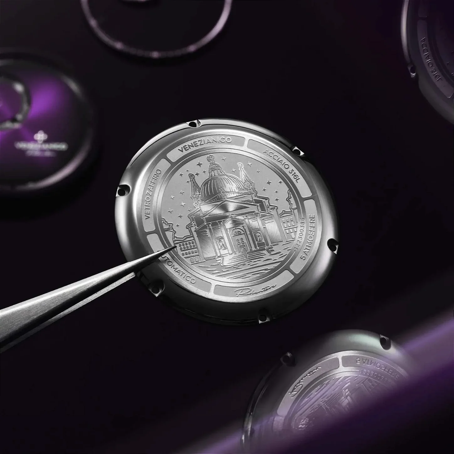 Inspirado na Basilica del Redentore de Palladio, o Redentore Enigma apresenta uma complicação regulador única que separa horas e minutos em eixos distintos. Com mostrador roxo fumé multicamadas em latão, este modelo revoluciona a leitura do tempo através de um subdial de 24 horas e ponteiro central dos minutos, unindo tradição relojoeira do século XVIII com design contemporâneo veneziano.